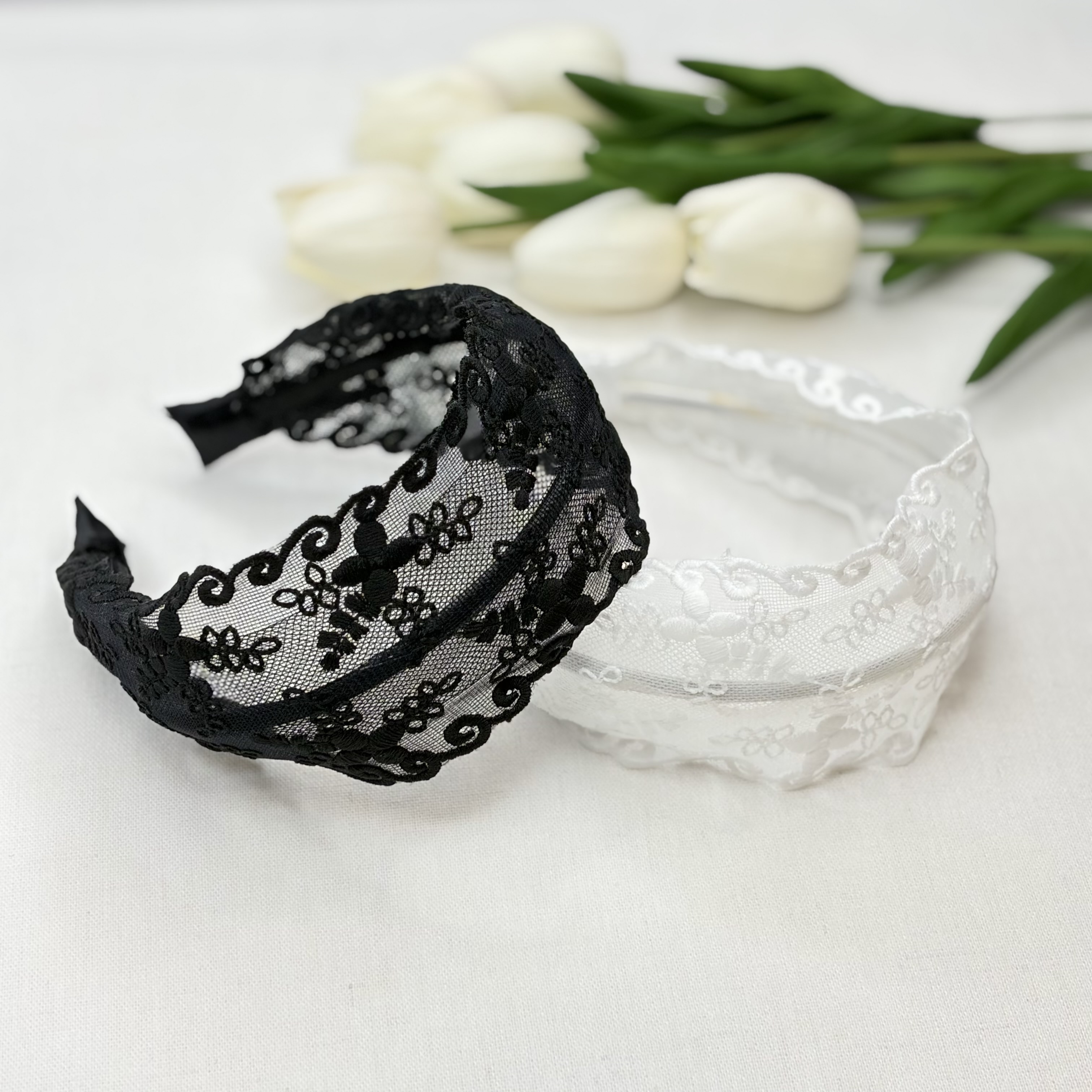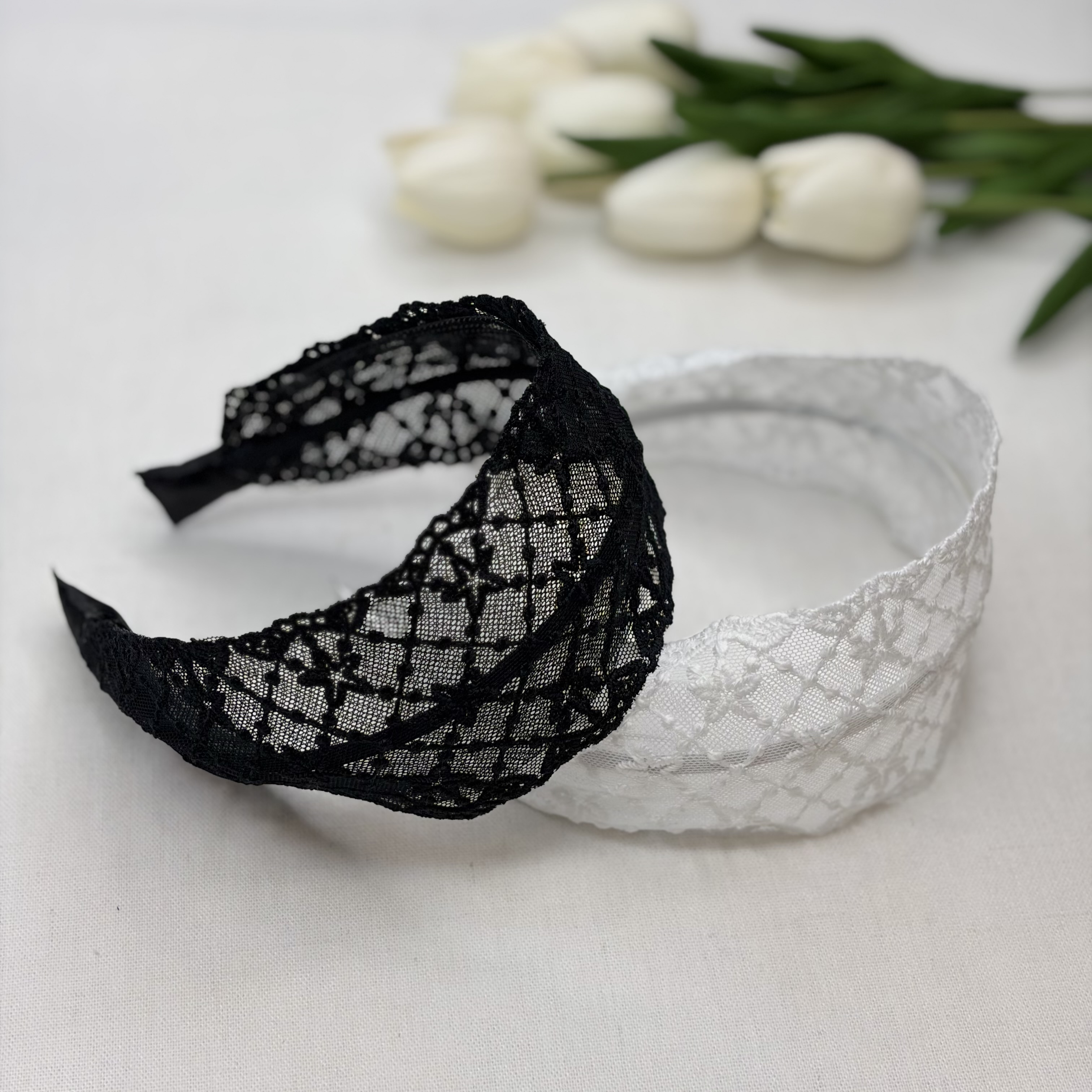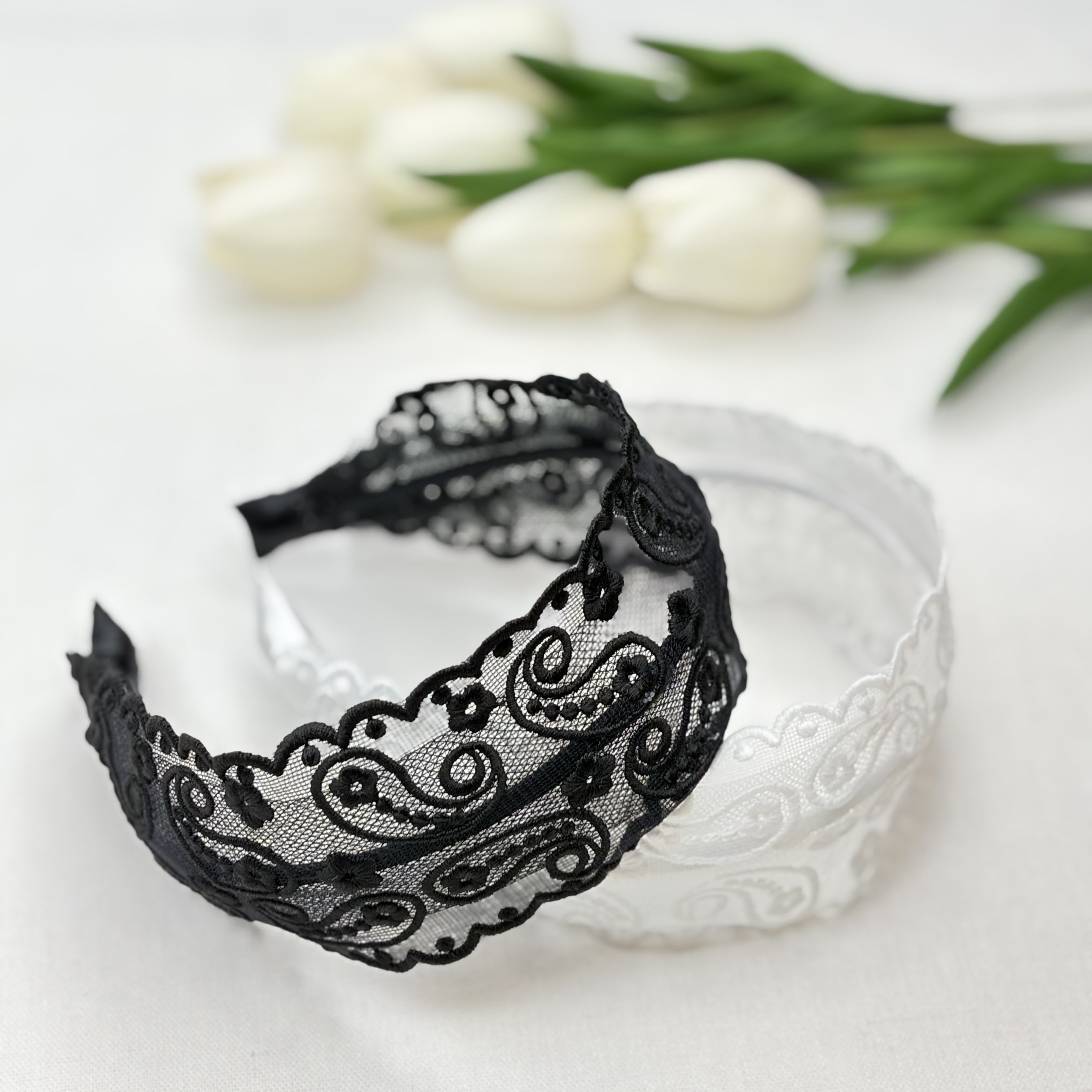 تل موی حریر طرح دار دانتل سفید ومشکی طرح ترمه