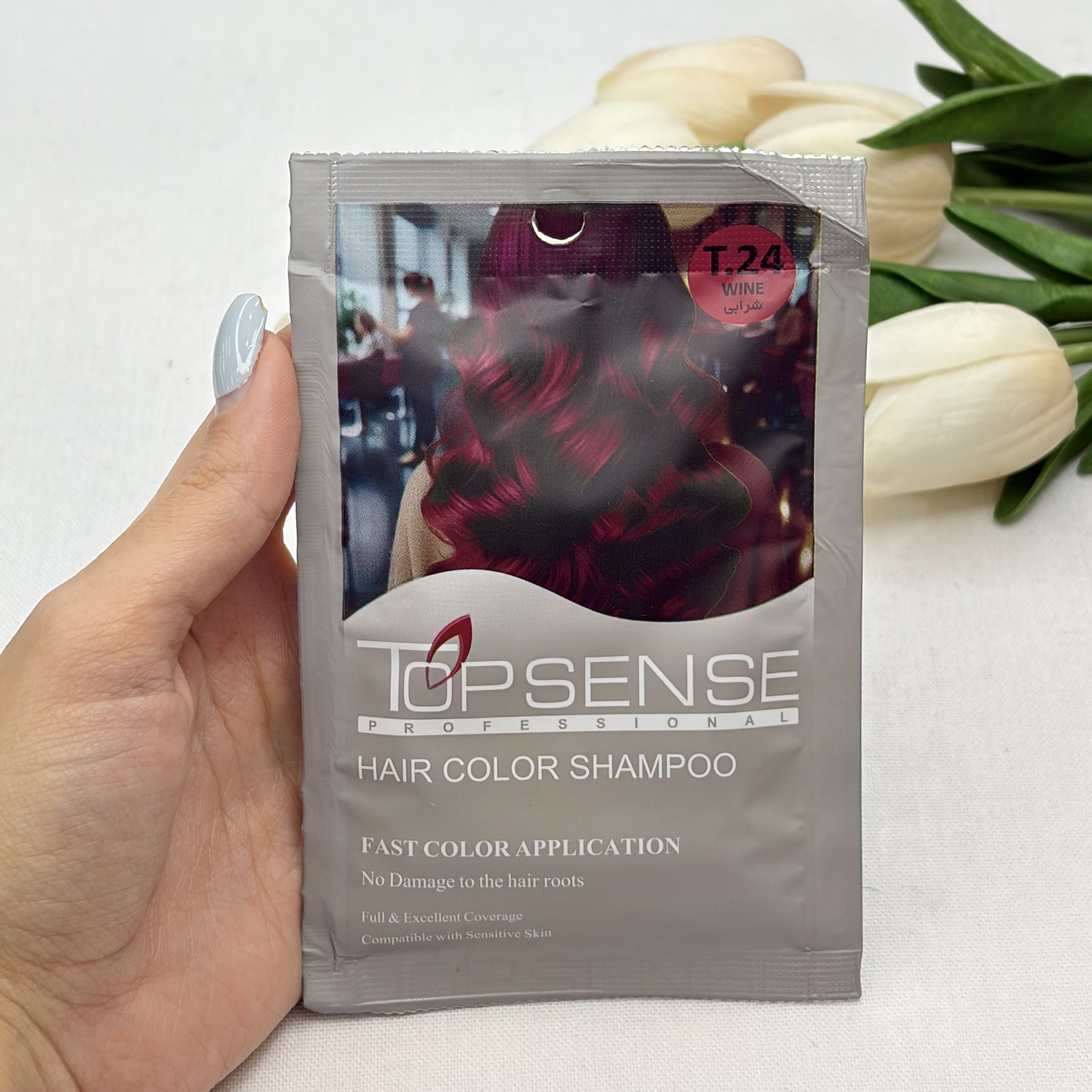 شامپو رنگ مو‌ ژله ای ساشه ای رنگ شرابی شماره T.24برند تاپ سنس TOP SENSE حجم ۳۰میل