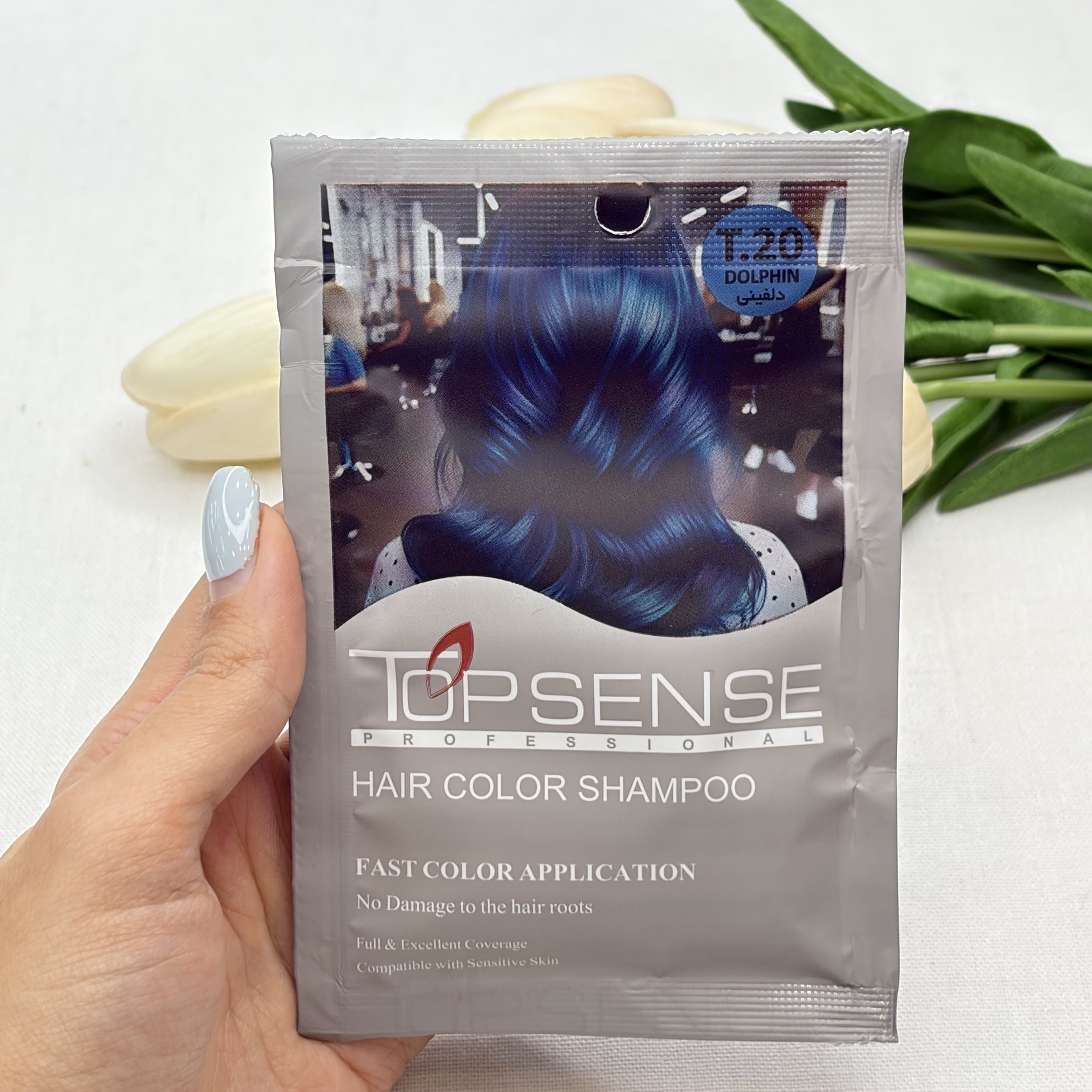 شامپو رنگ مو‌ ژله ای ساشه ای رنگ دلفینی شماره T.20برند تاپ سنس TOP SENSE حجم ۳۰میل