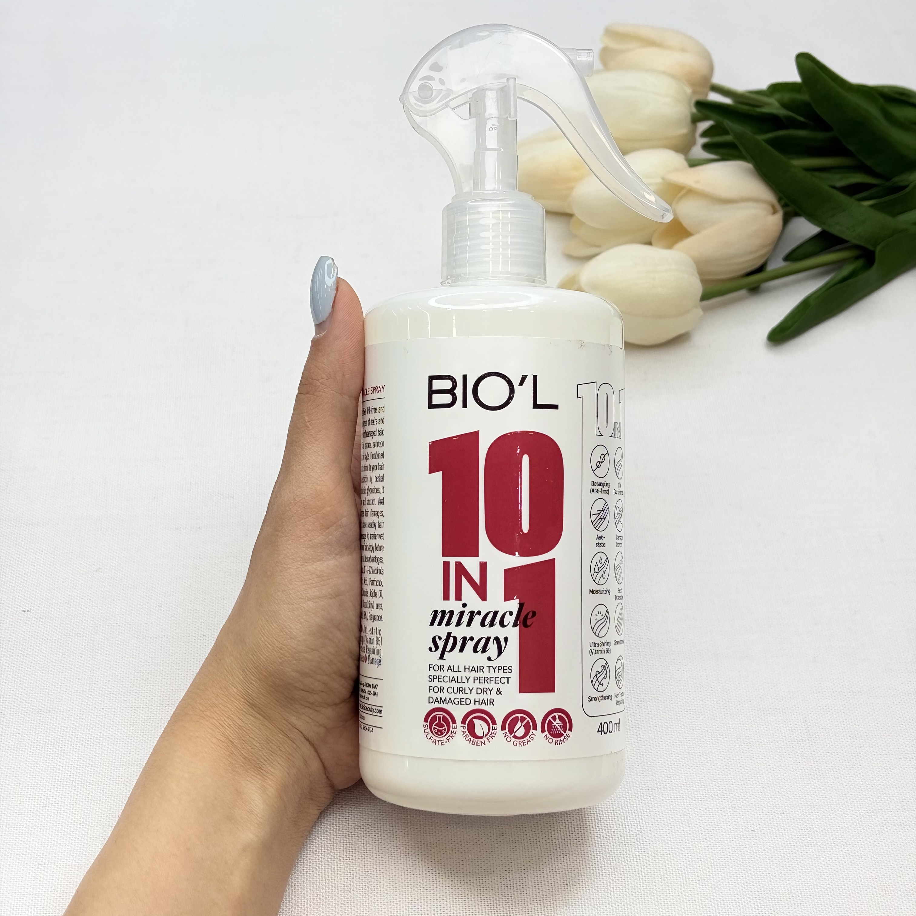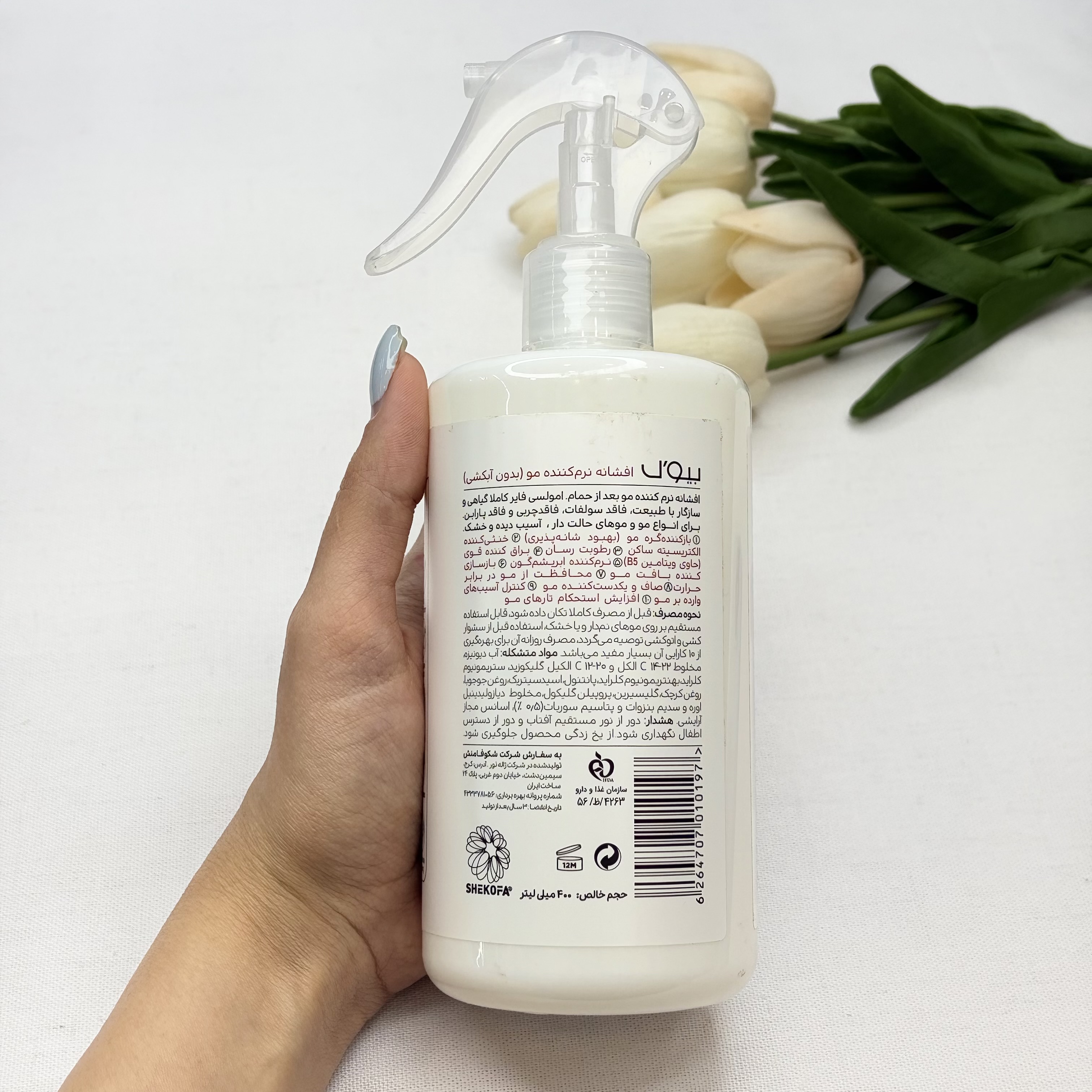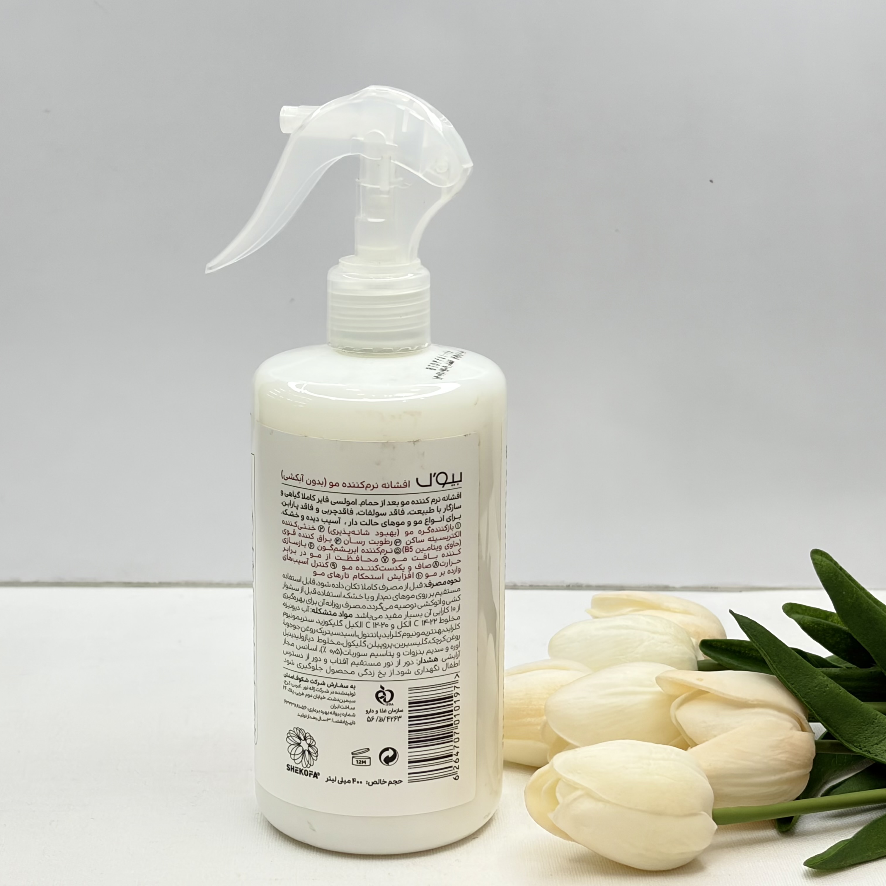 اسپری مو بیول حجم 400 میل بازکننده گره مو، رطوبت‌رسان، براق کننده قوی، نرم کننده ده در یک مناسب موهای فر خشک و انواع مو