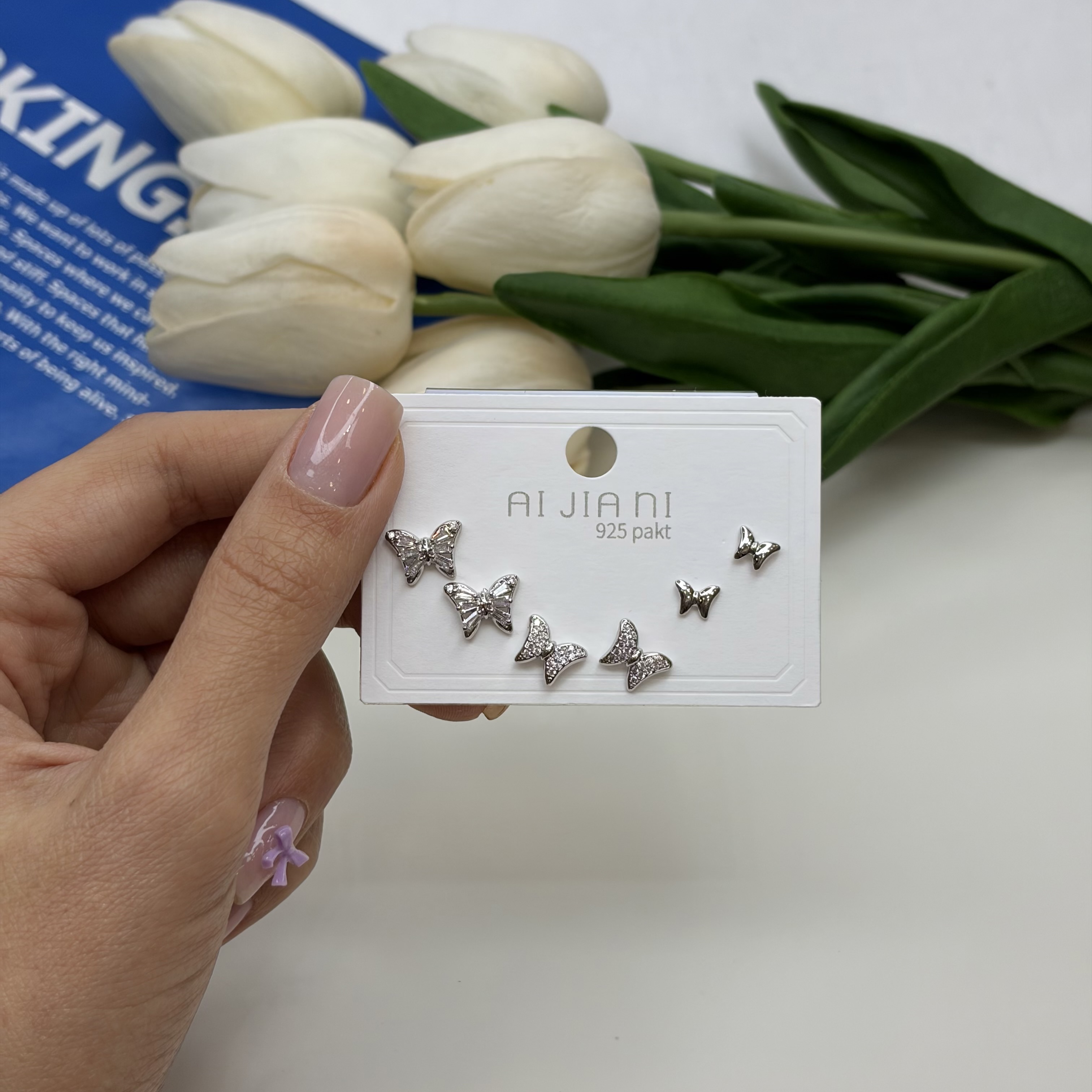 پک گل گوش ۳تایی میخ نقره مناسب پوست های حساس به زیورآلات طرح پروانه