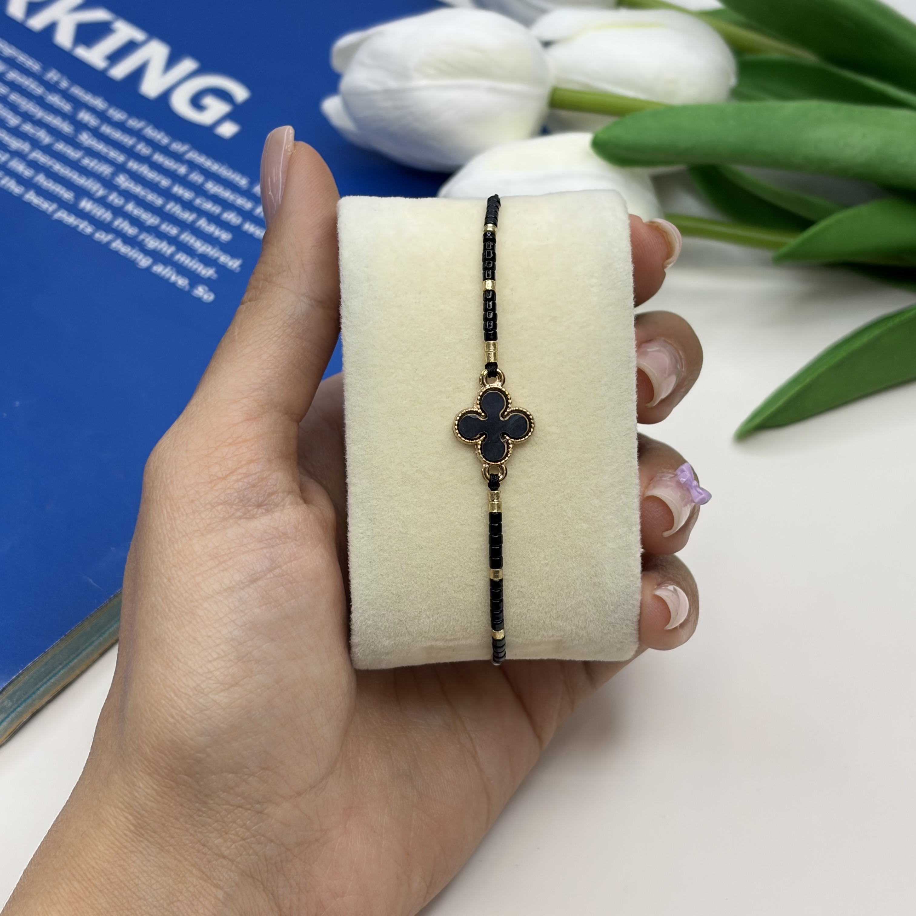 دستبند مشکی ونکلیف صدفی منجوق میوکی فری سایز گره کشویی نخی