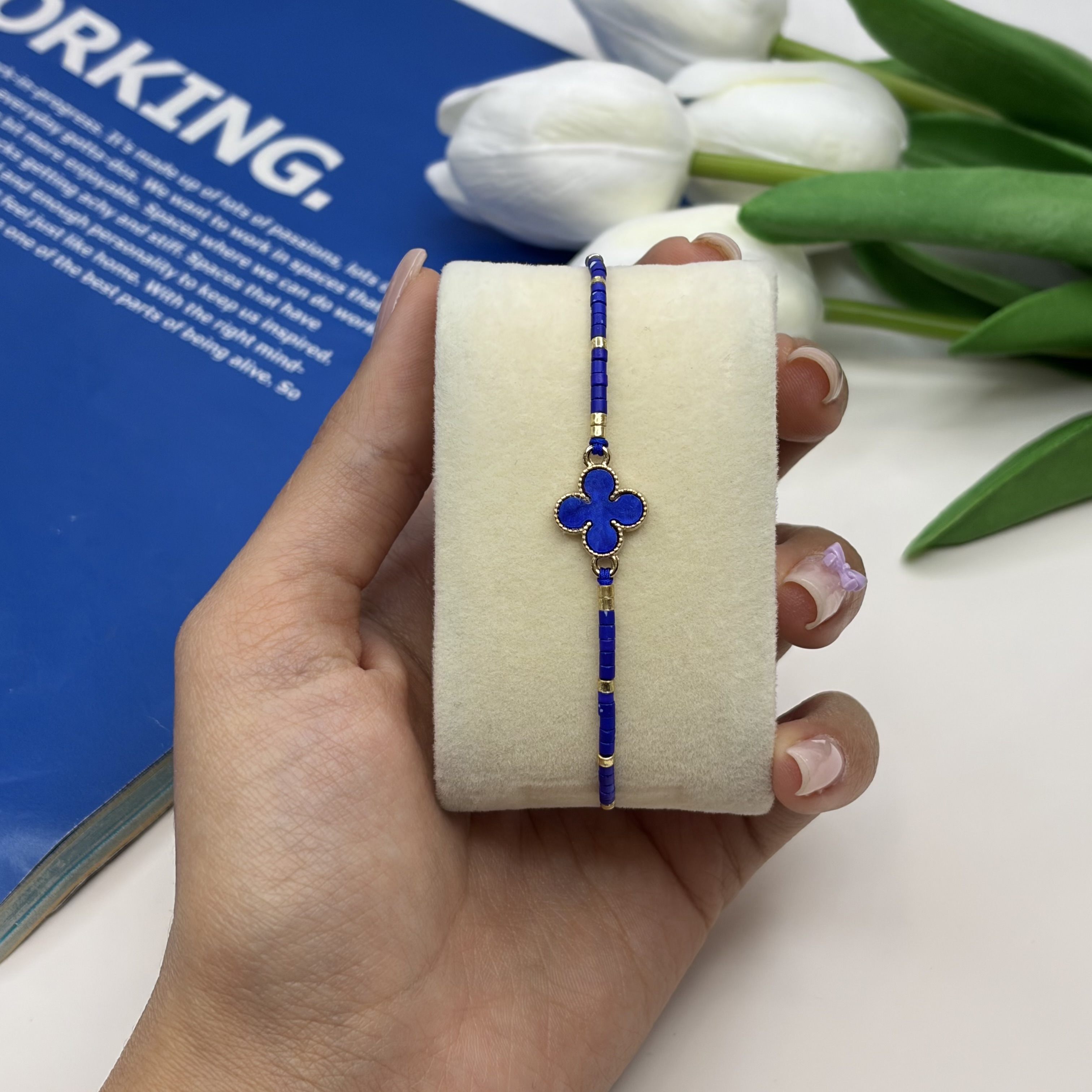 دستبند آبی کاربنی ونکلیف صدفی منجوق میوکی فری سایز گره کشویی نخی