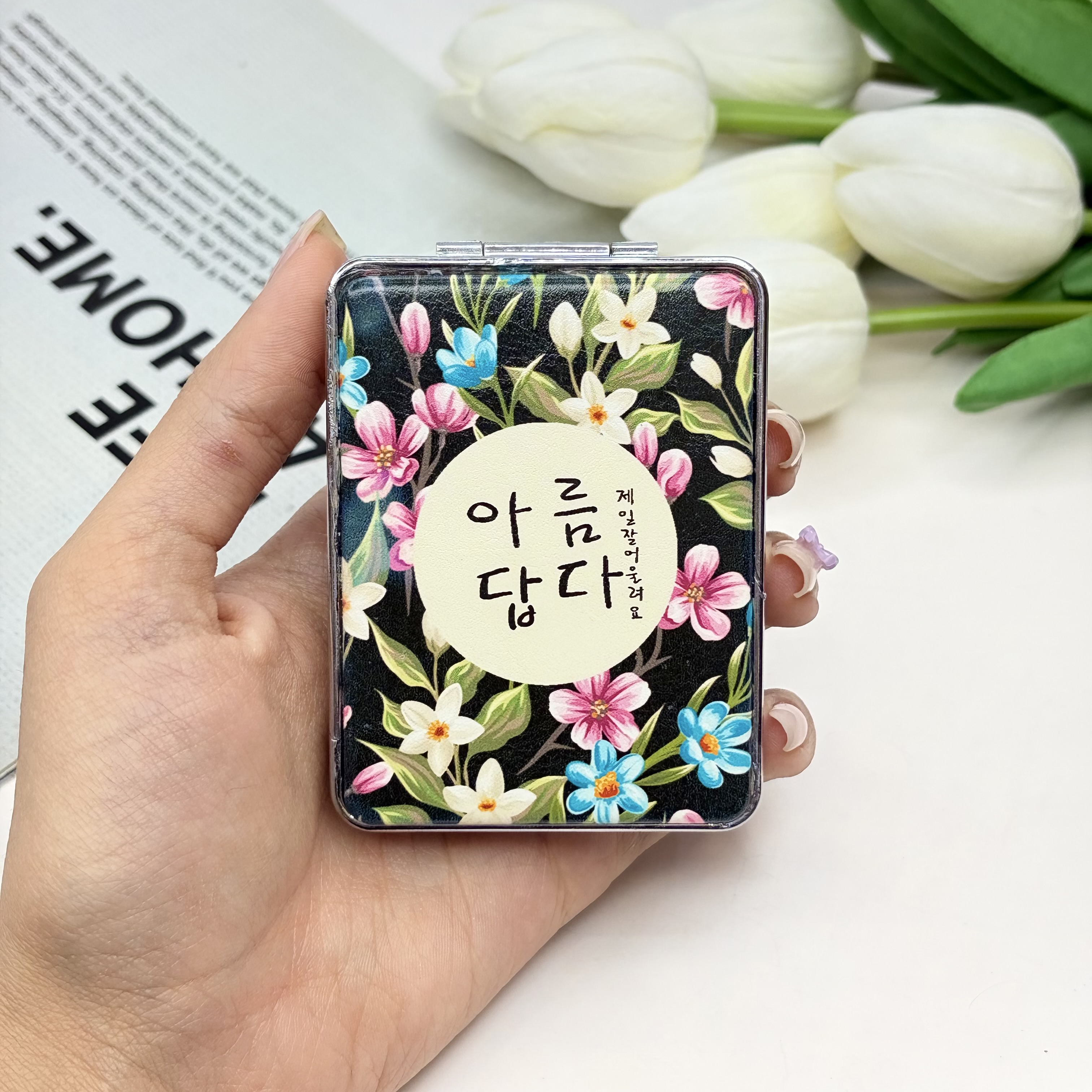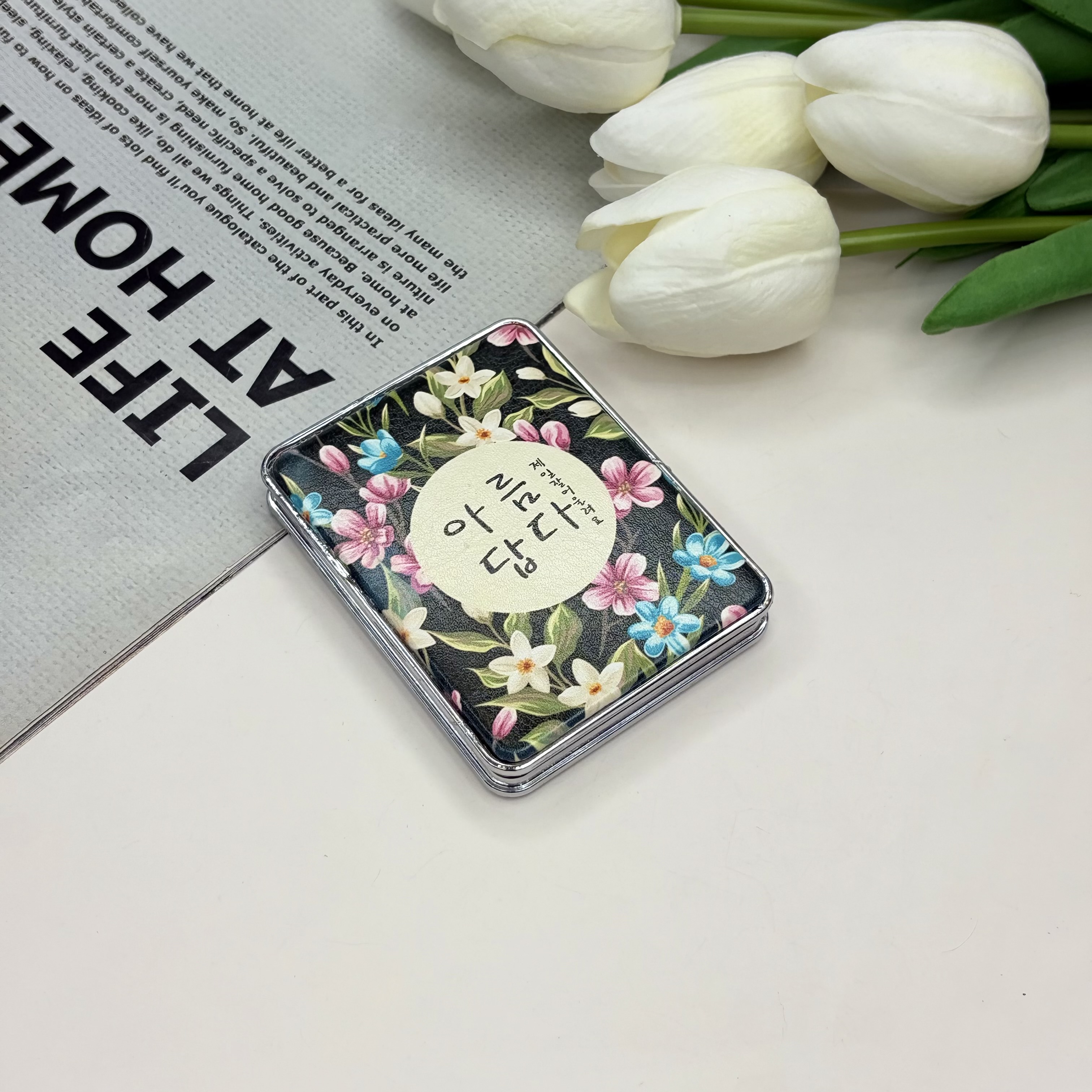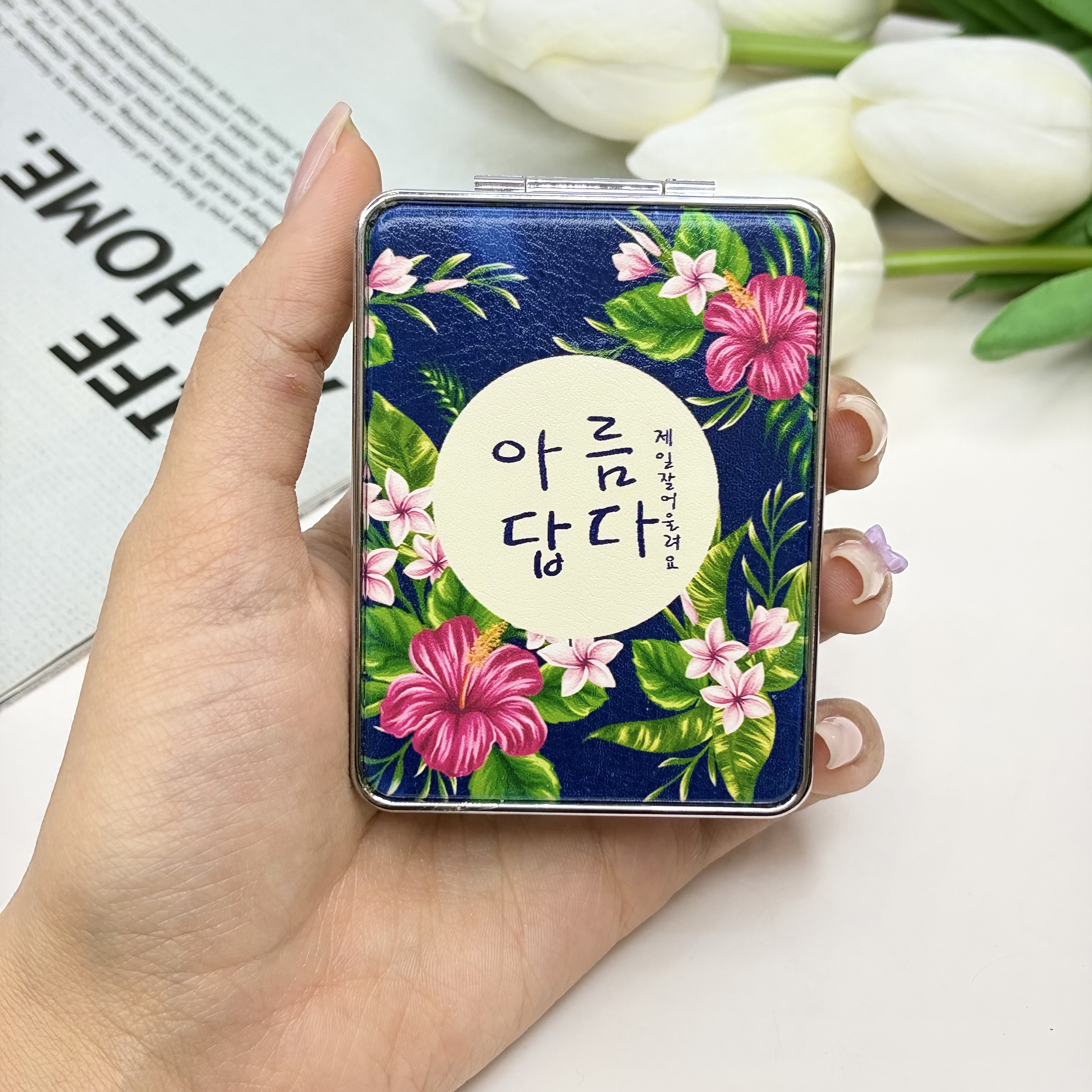 آینه جیبی دوطرفه طرح گلدار فلزی و‌چرمی‌مستطیل7.5cm در 6.5cm