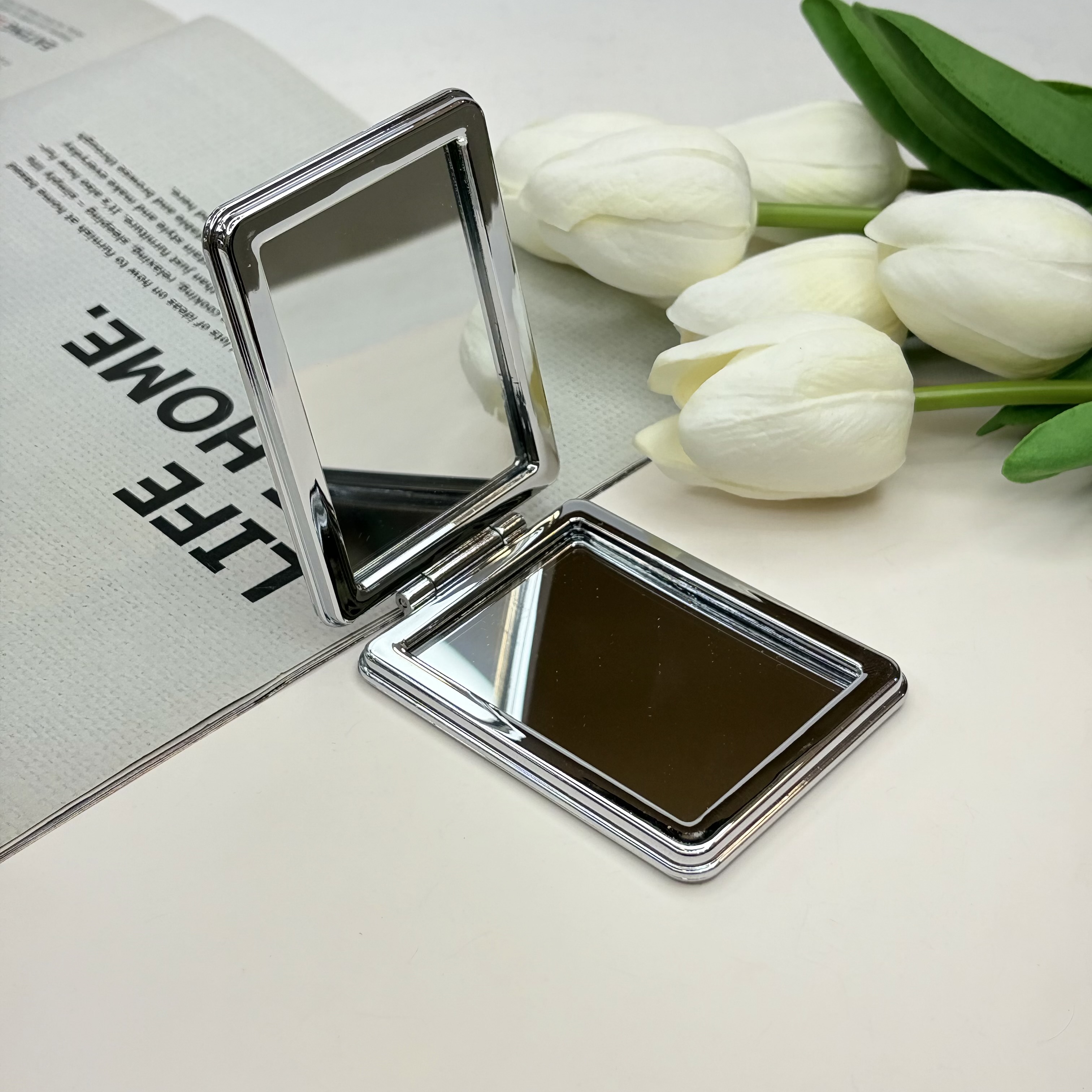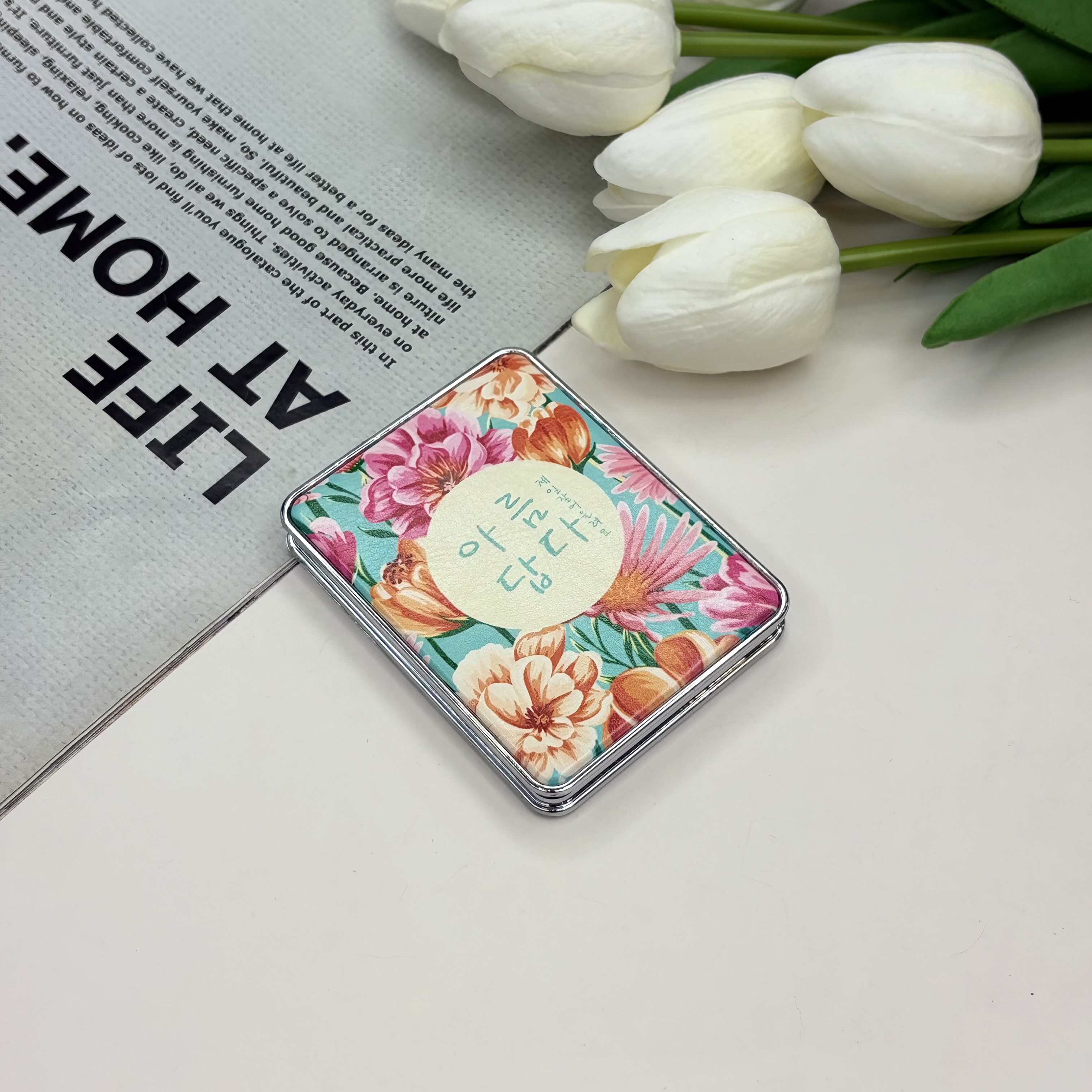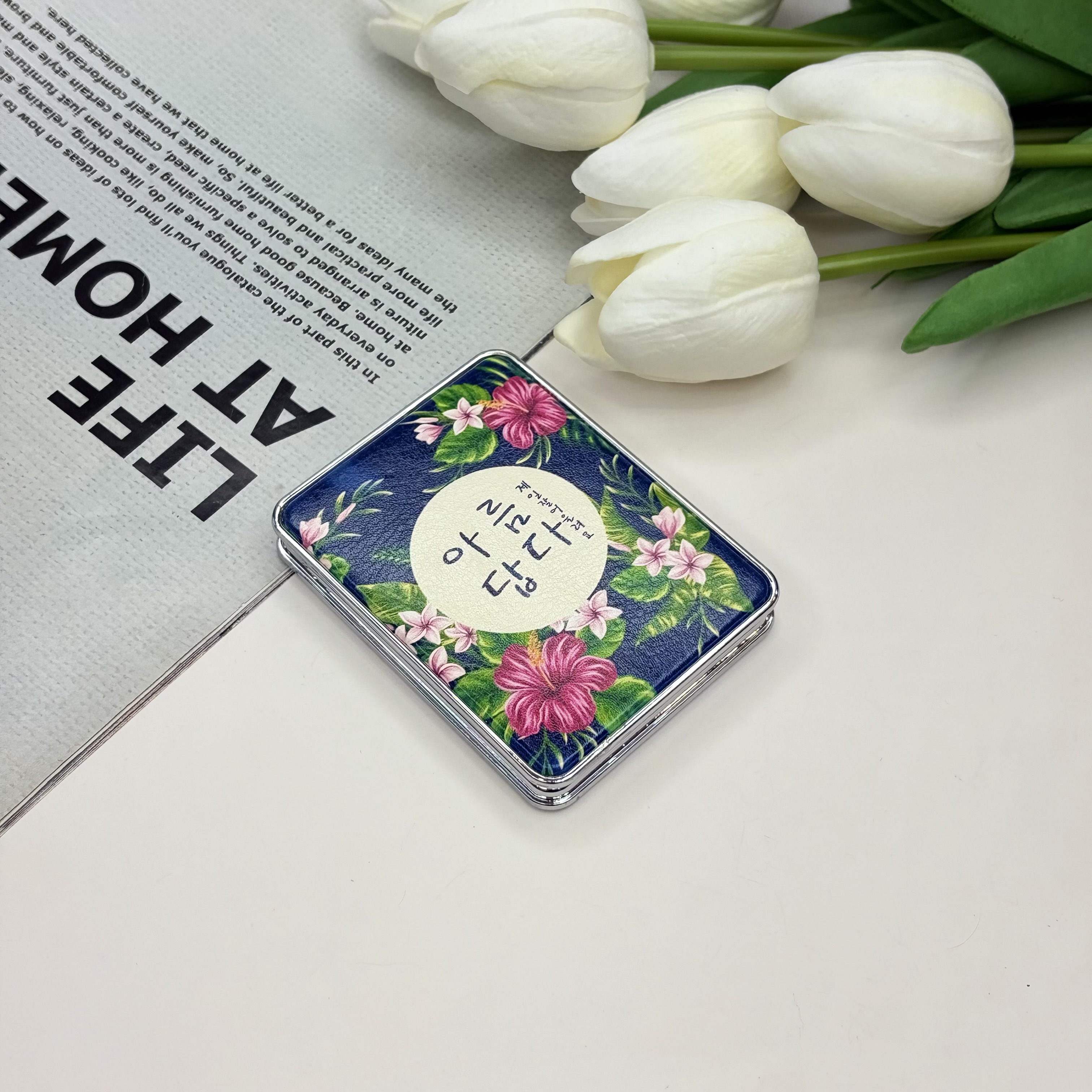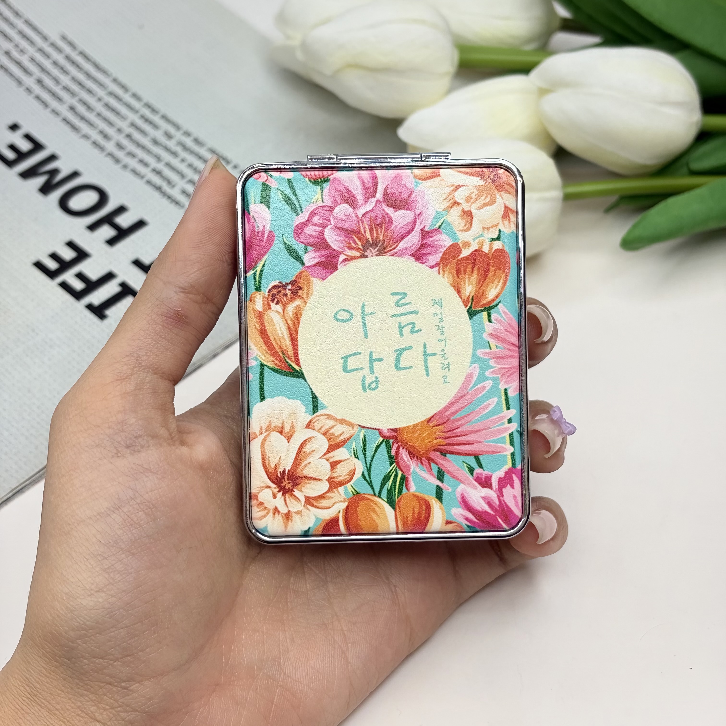 آینه جیبی دوطرفه طرح گلدار فلزی و‌چرمی‌مستطیل7.5cm در 6.5cm