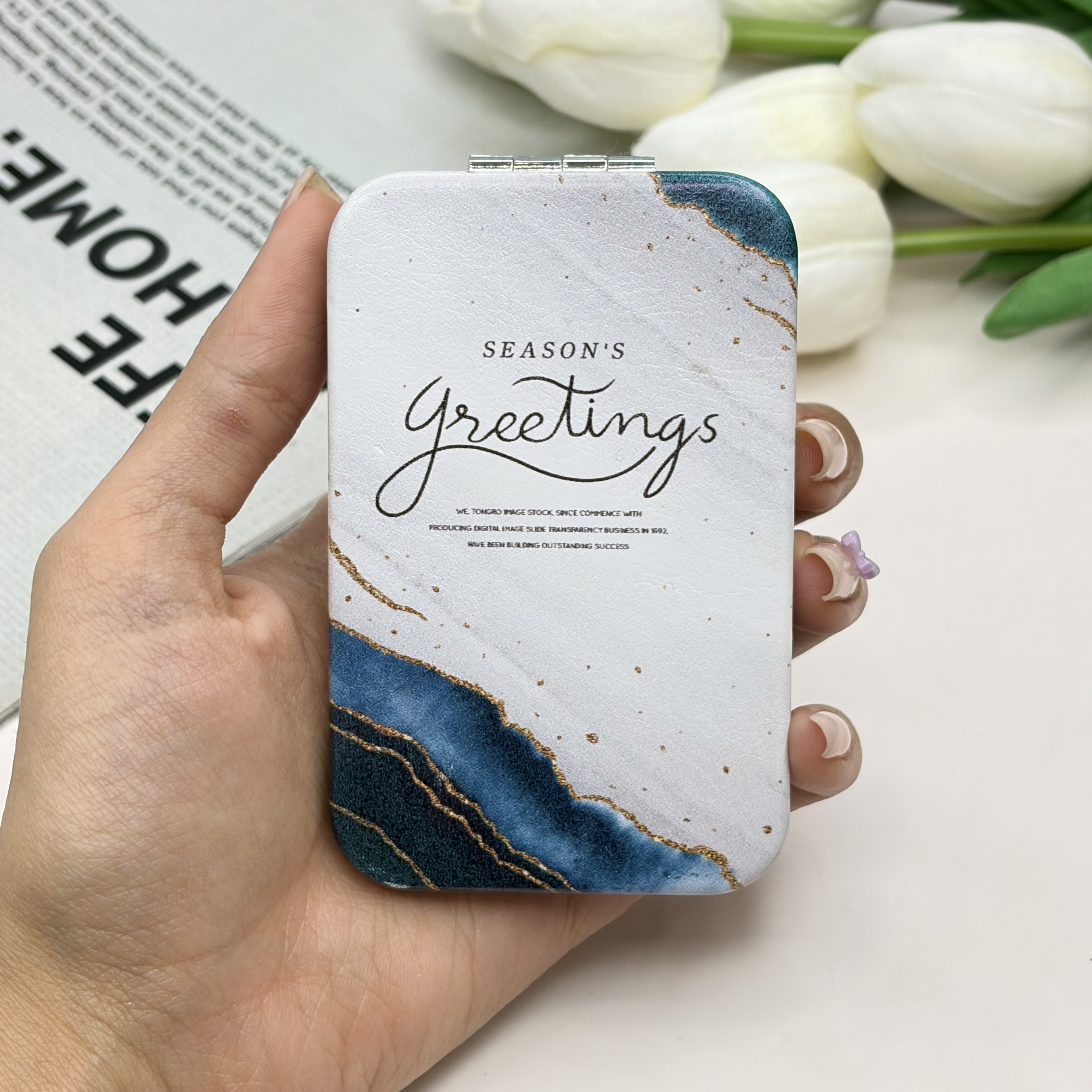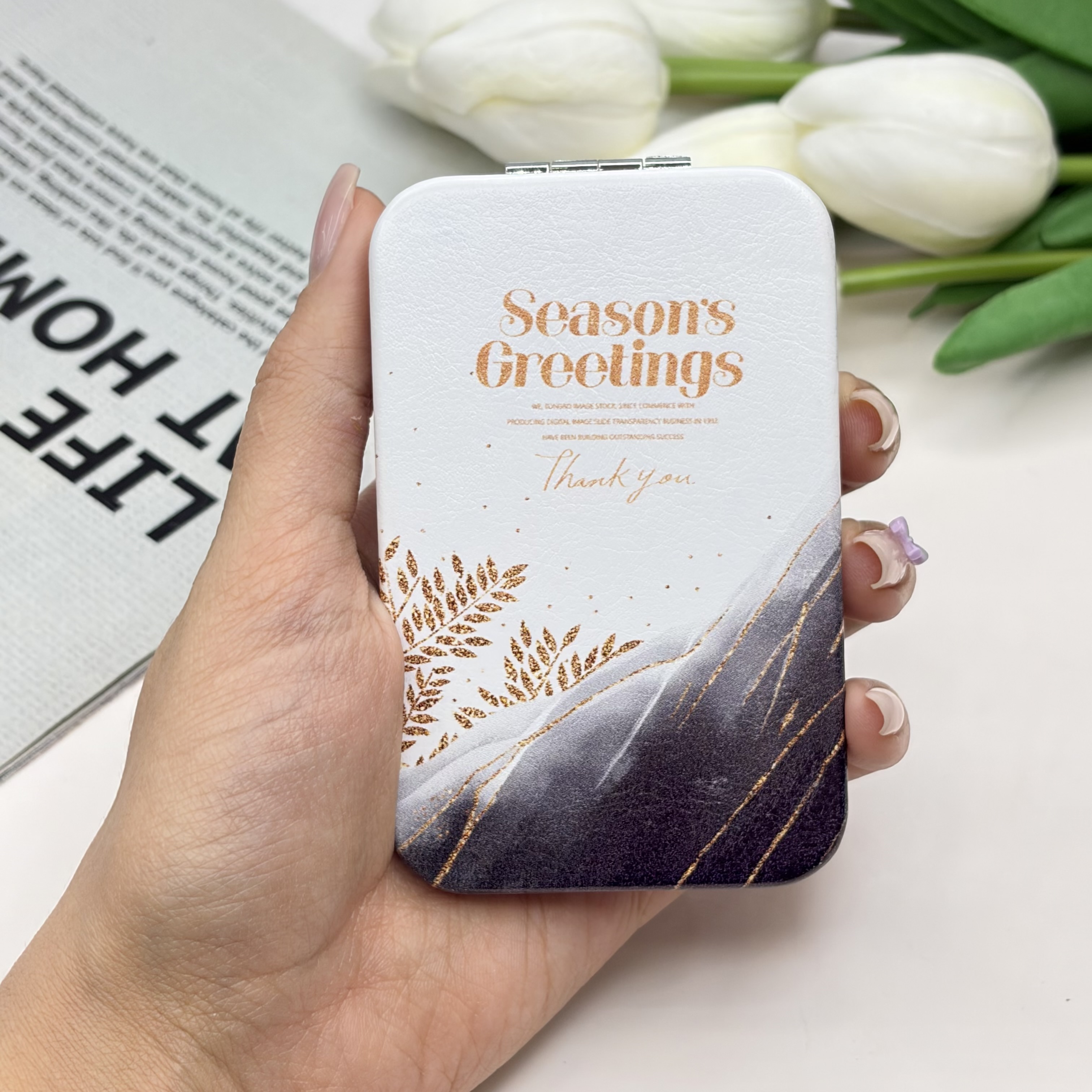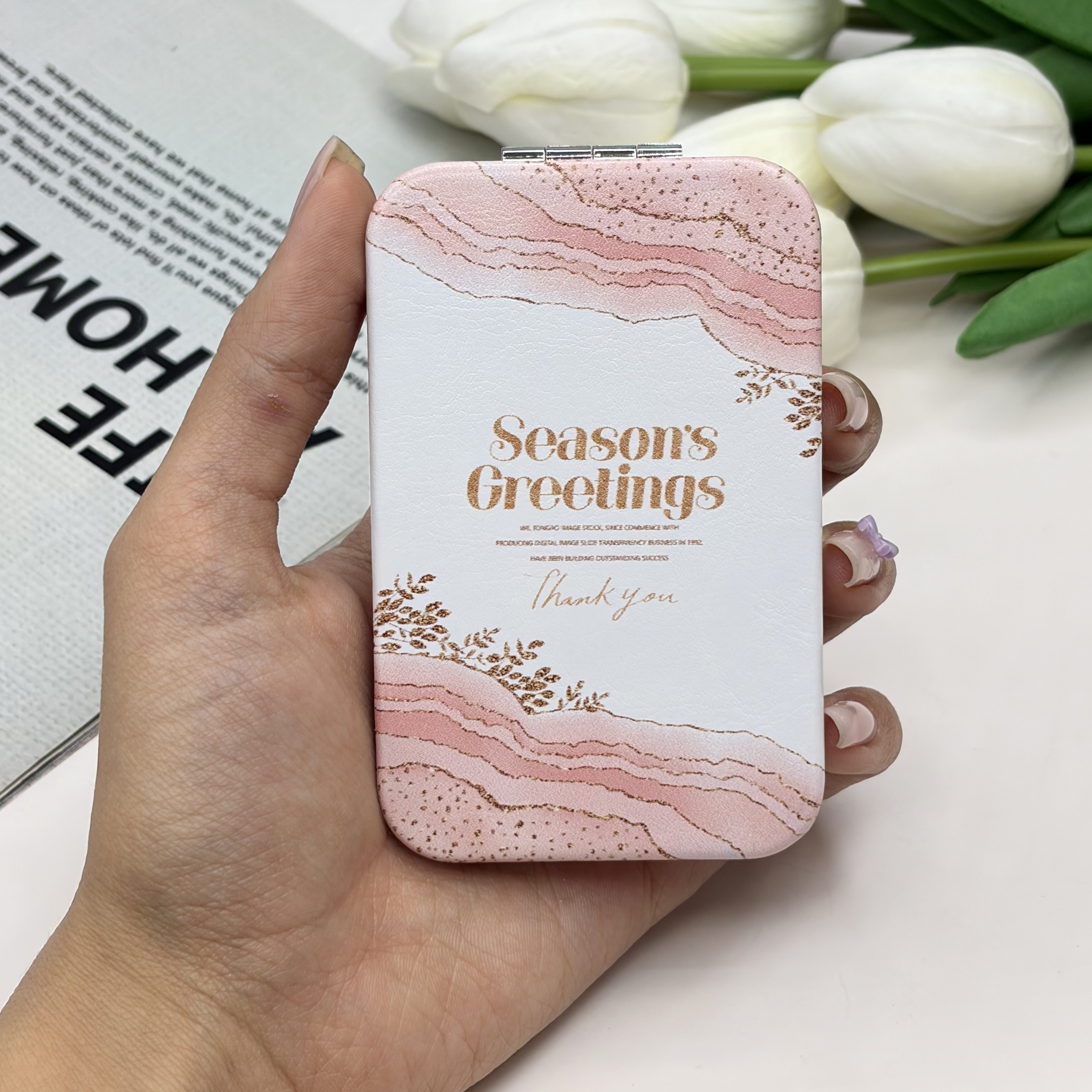 آینه جیبی دوطرفه طرح SeaSon Greeting مستطیل چرم 9.5cm در 6cm