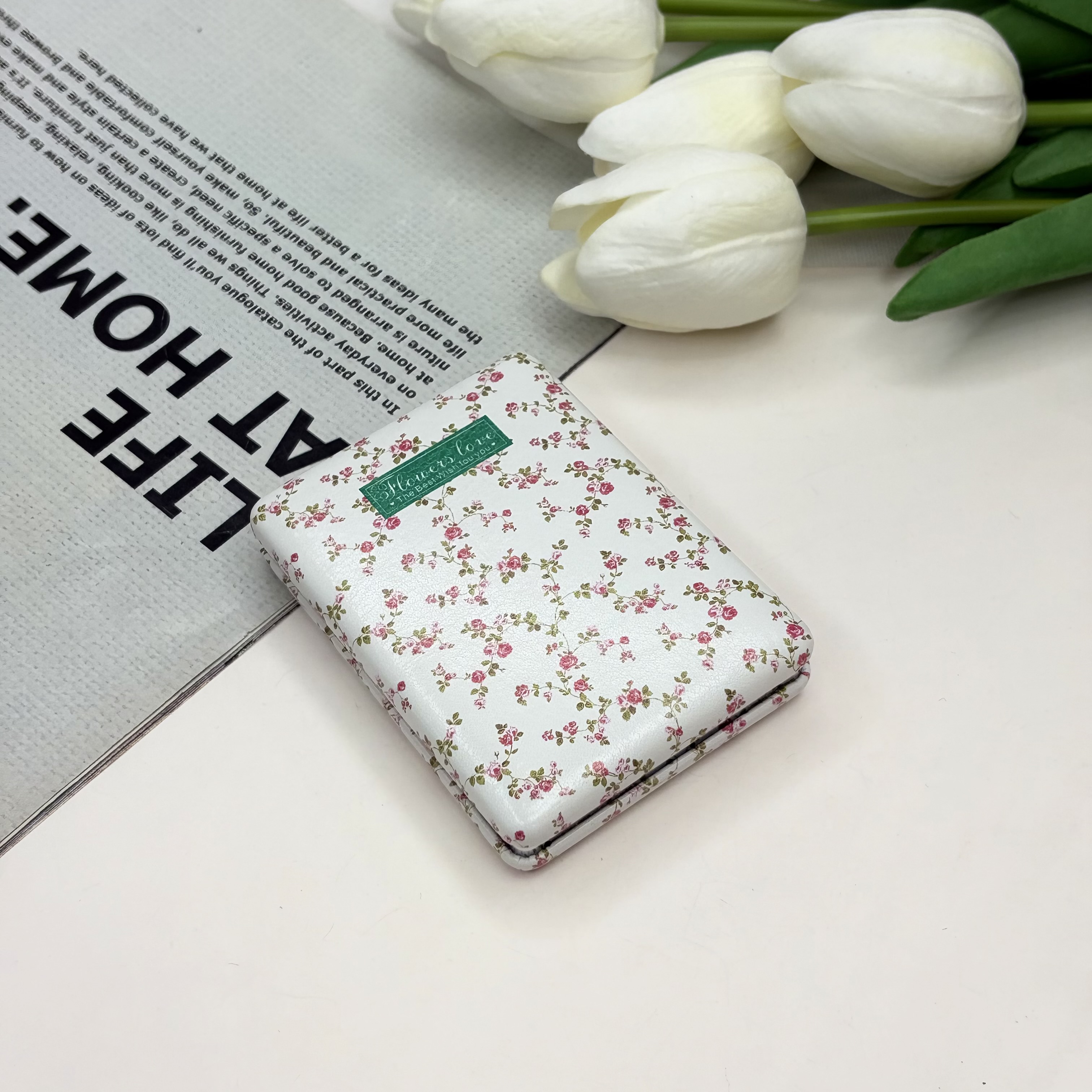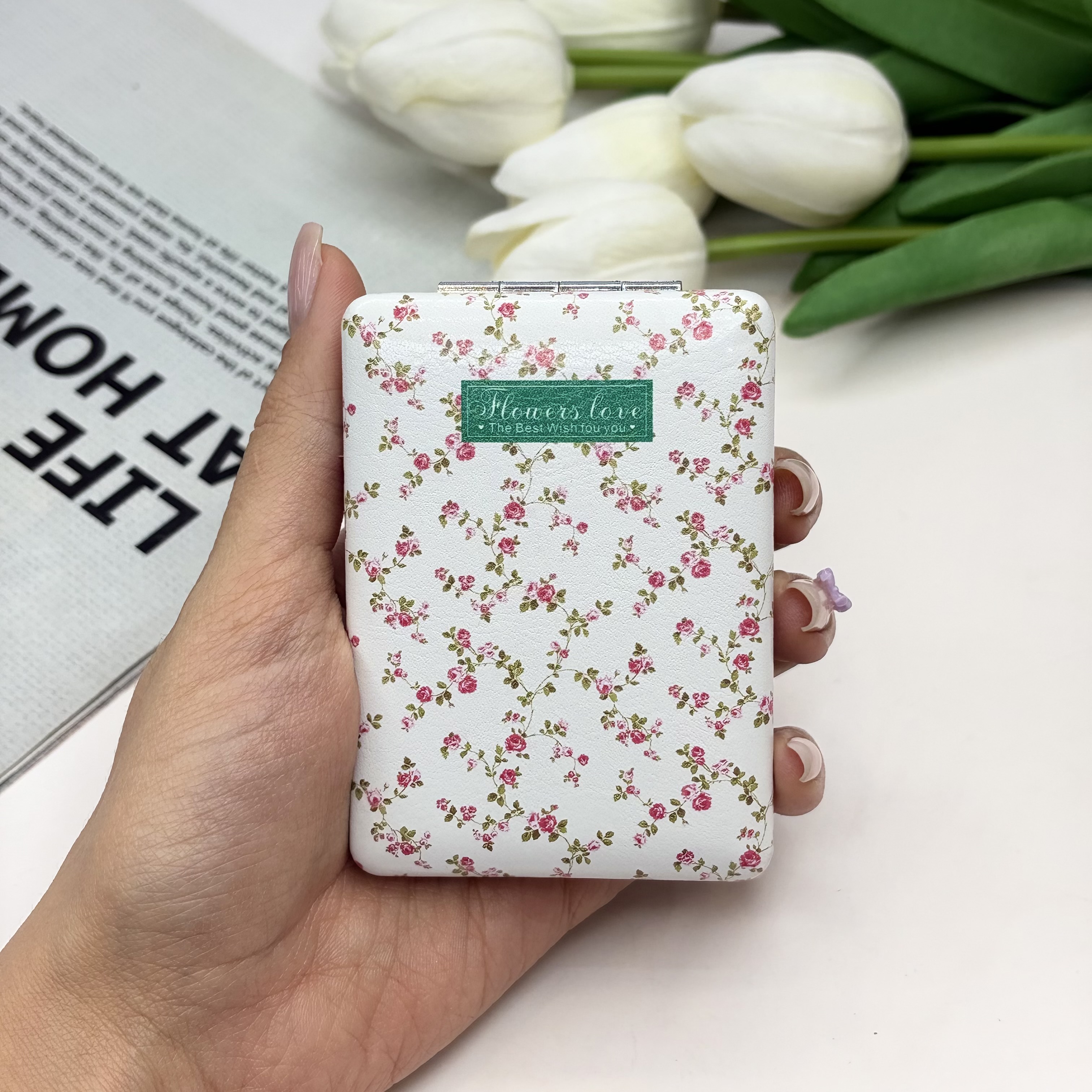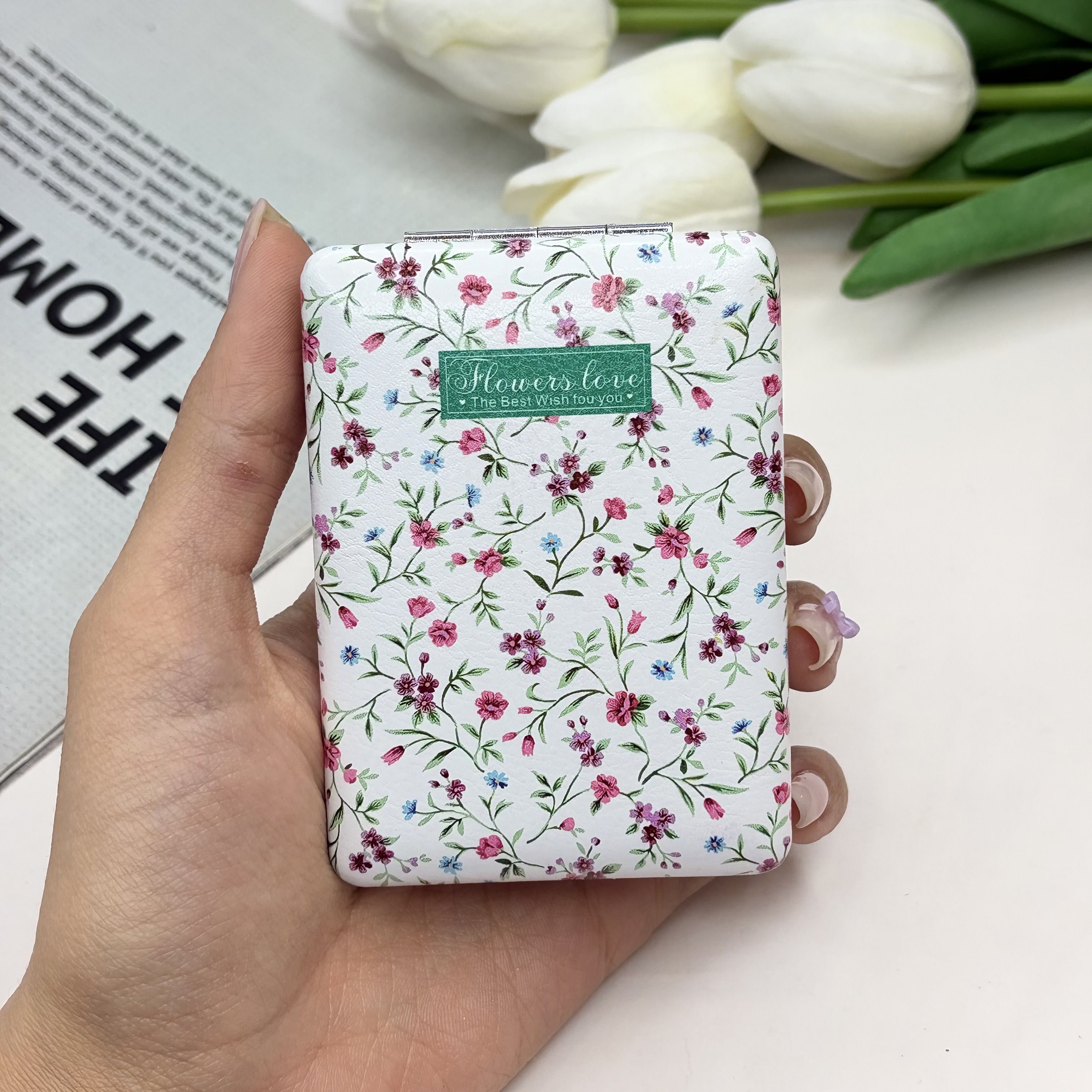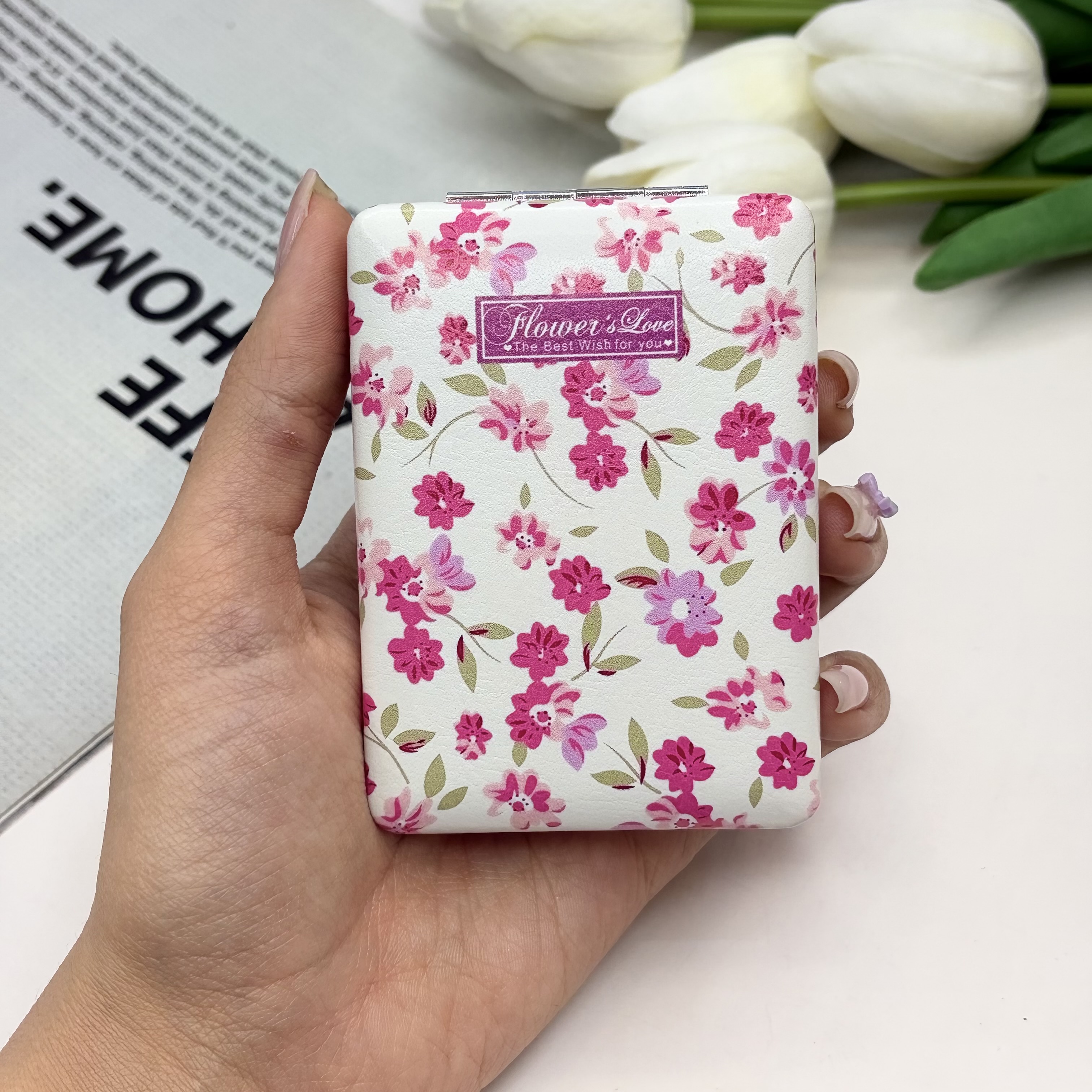 آینه جیبی دوطرفه طرح گلدار ریز چرمی مستطیل8.5cm در 6cm
