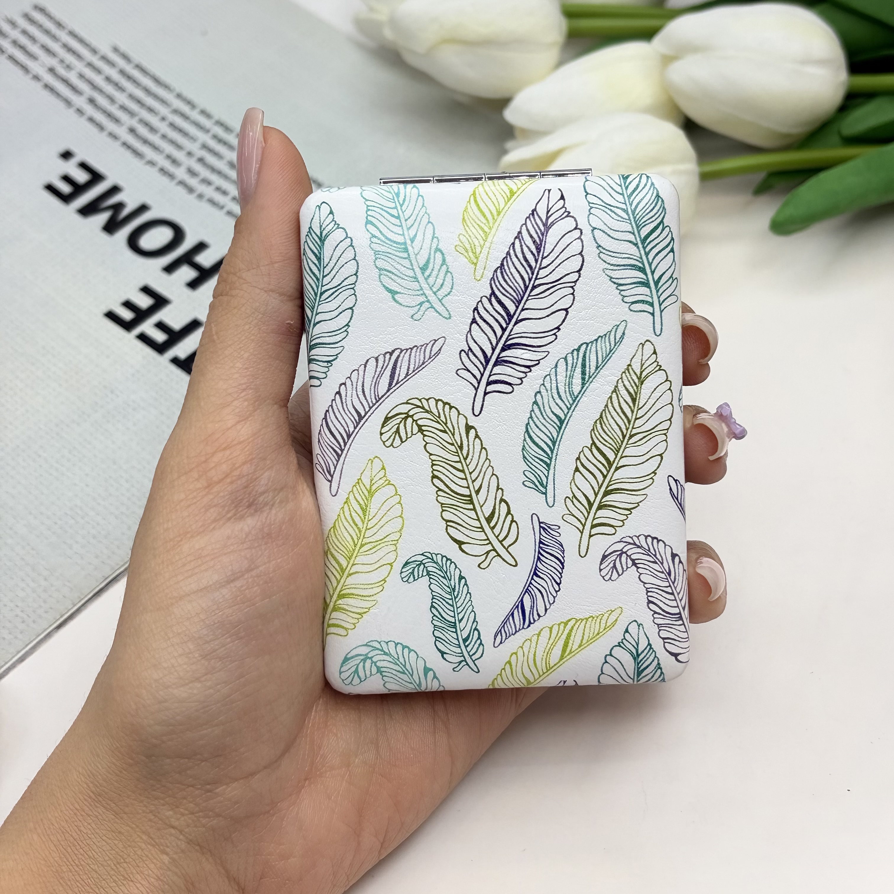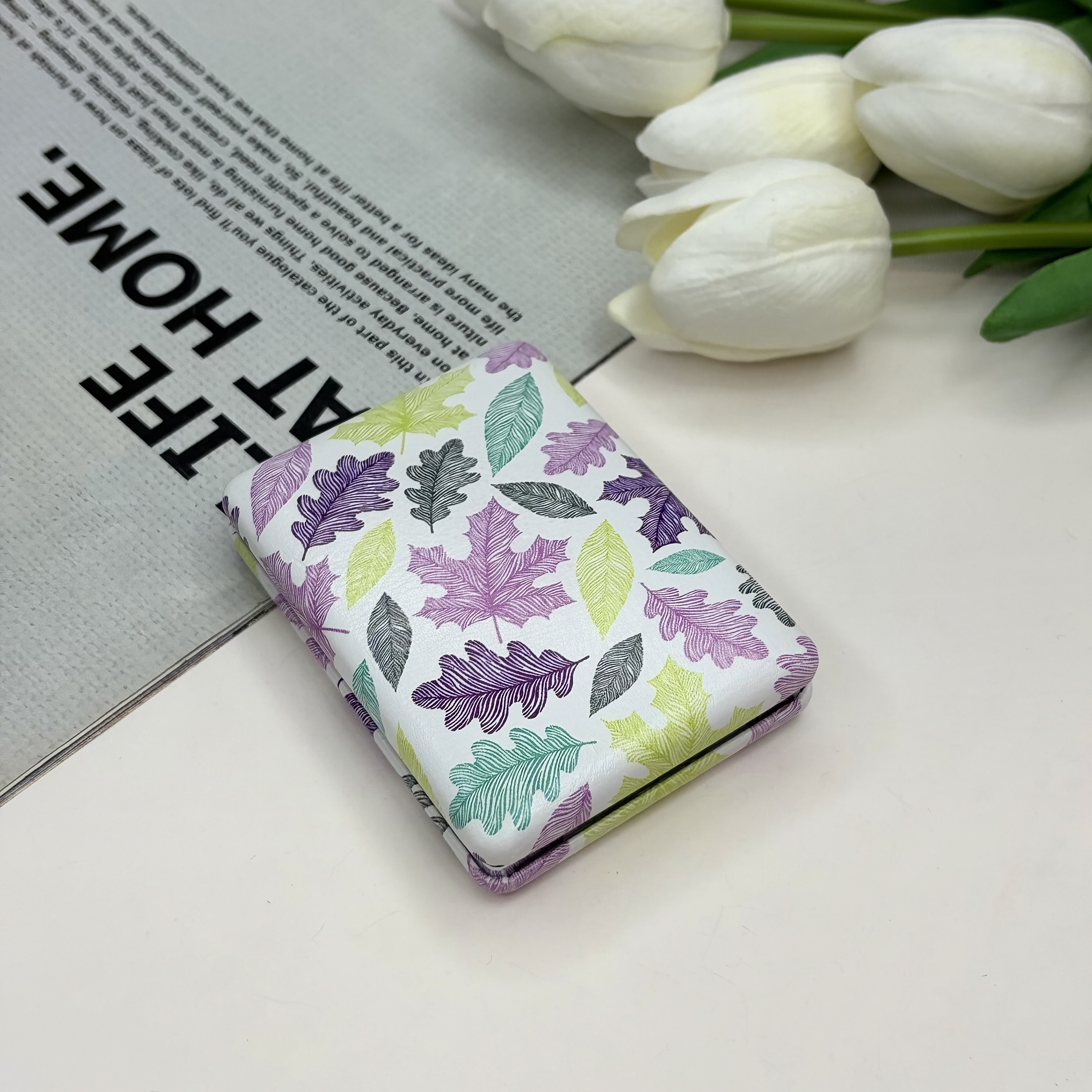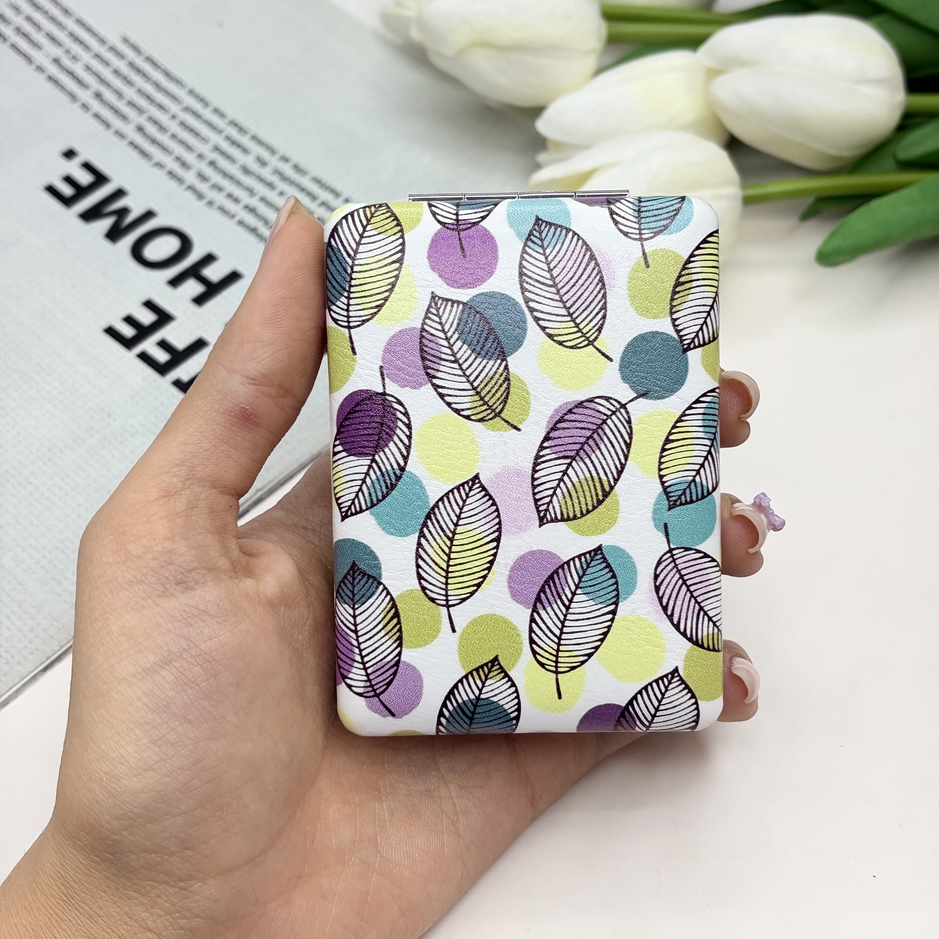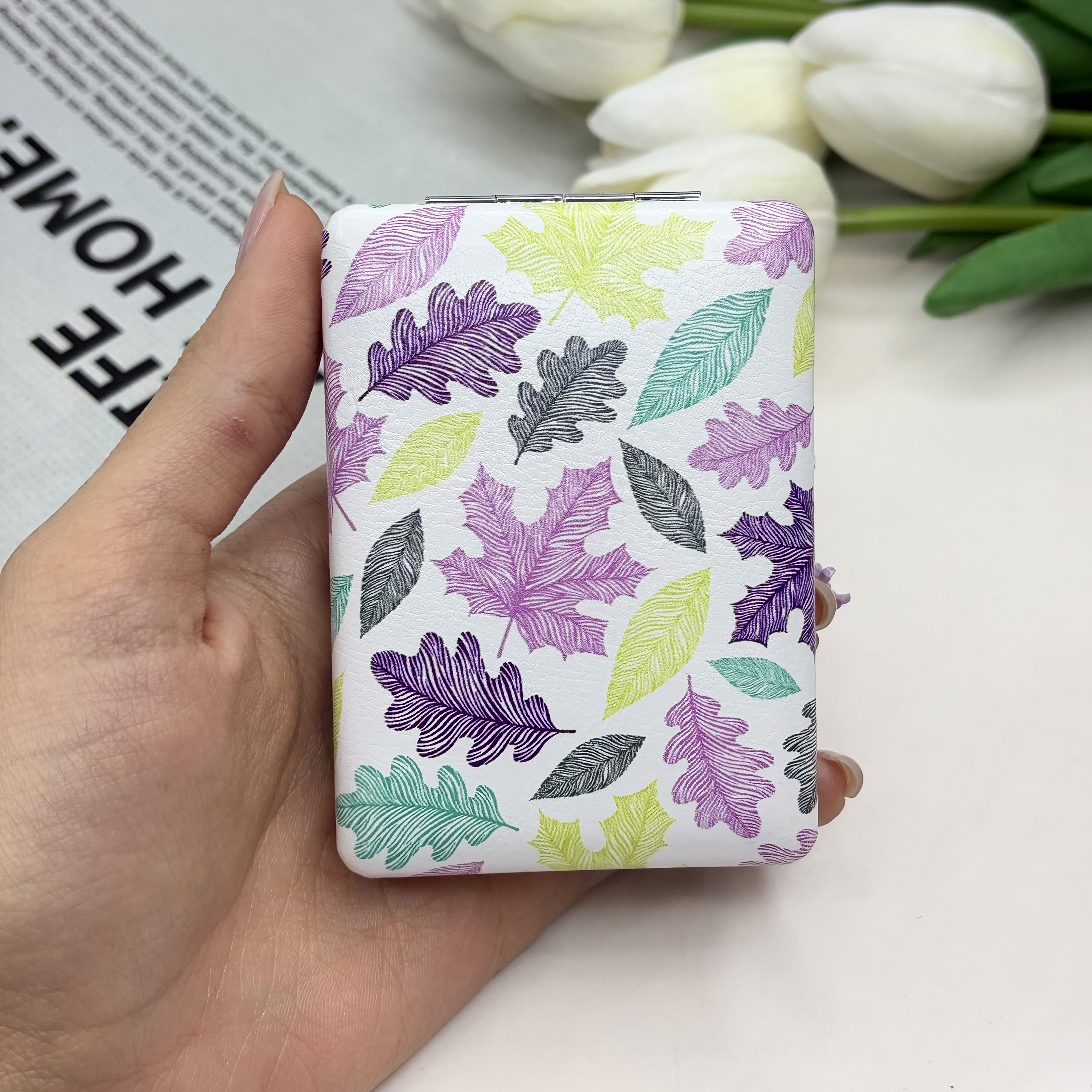 آینه جیبی دوطرفه طرح برگ مستطیلی چرم 8.5cm در 6cm