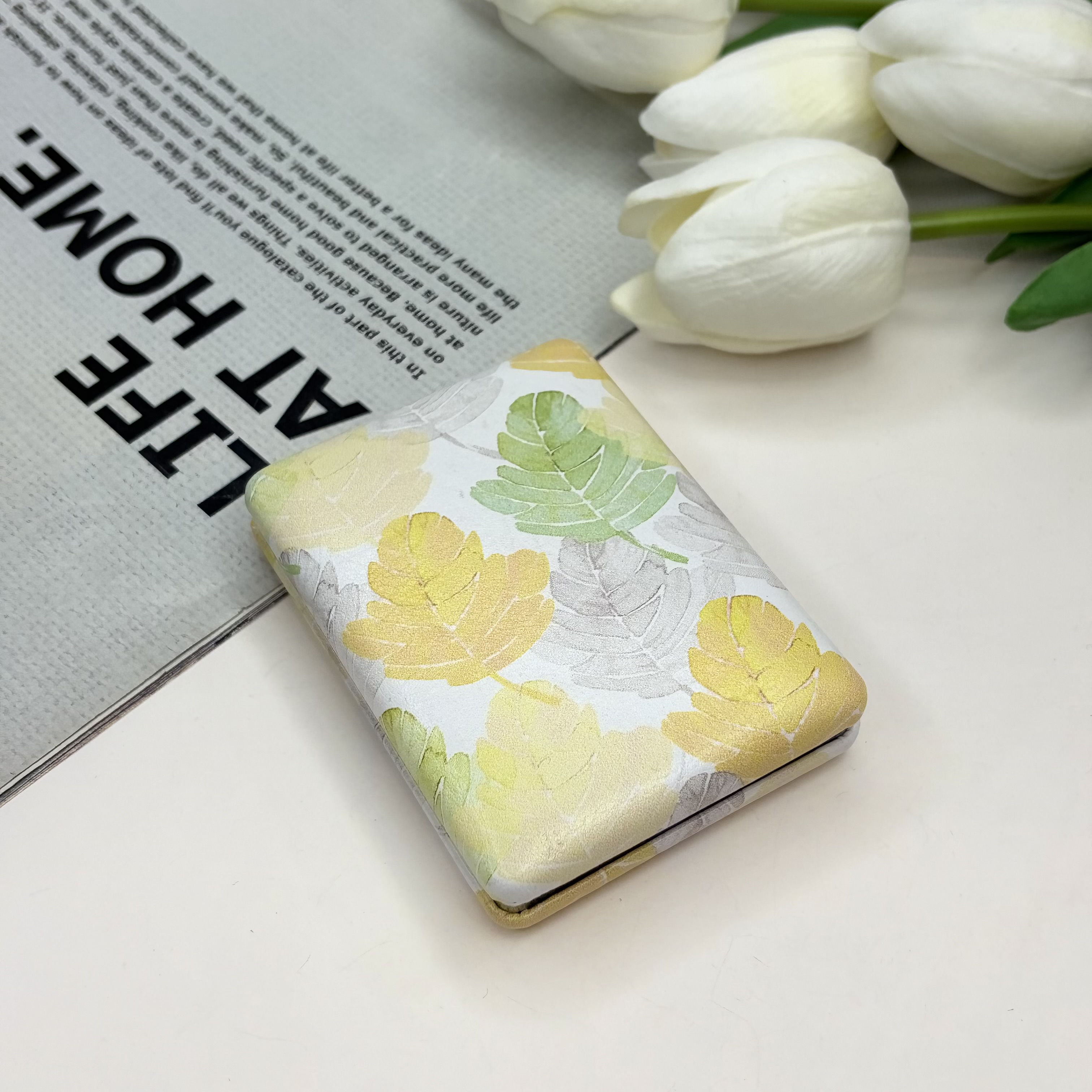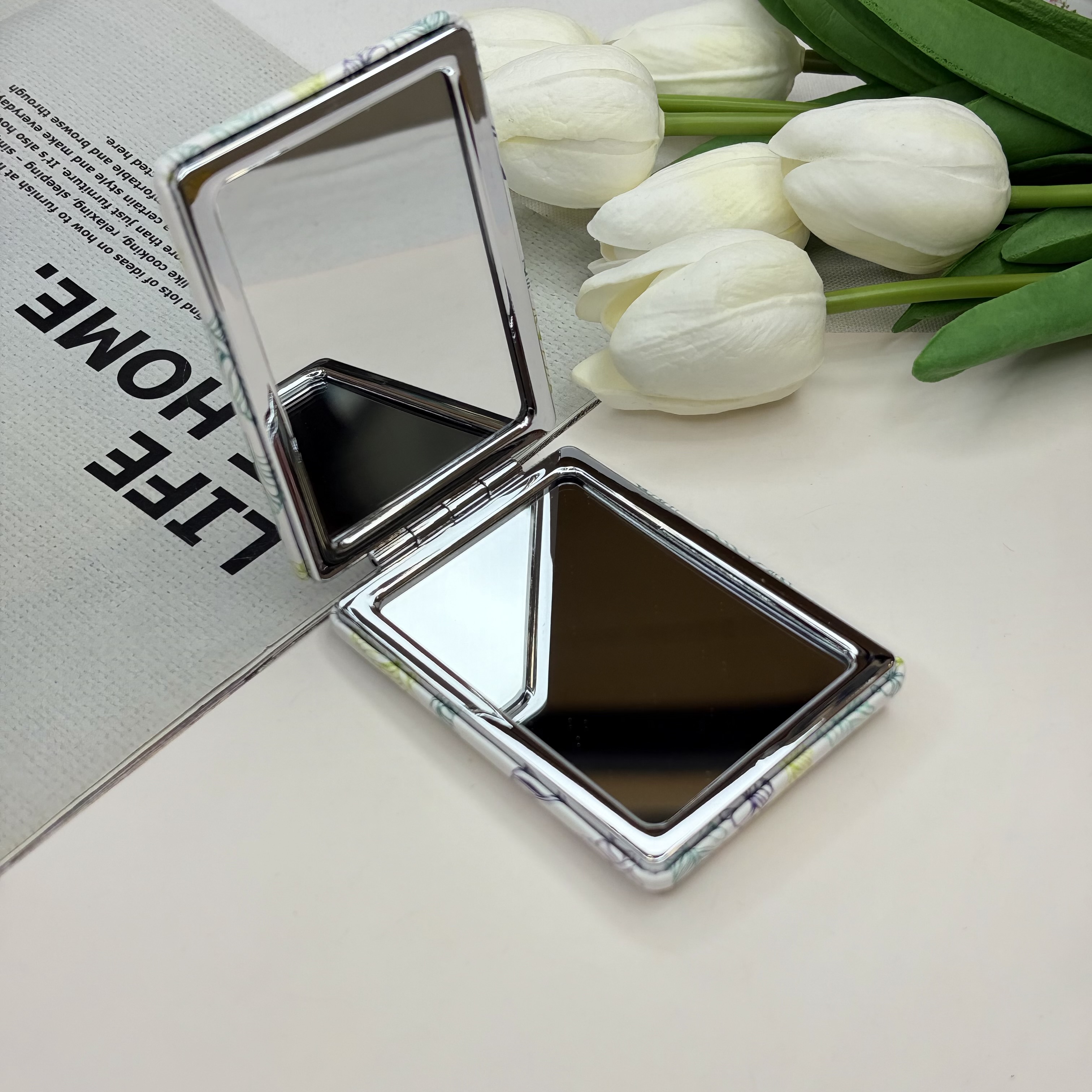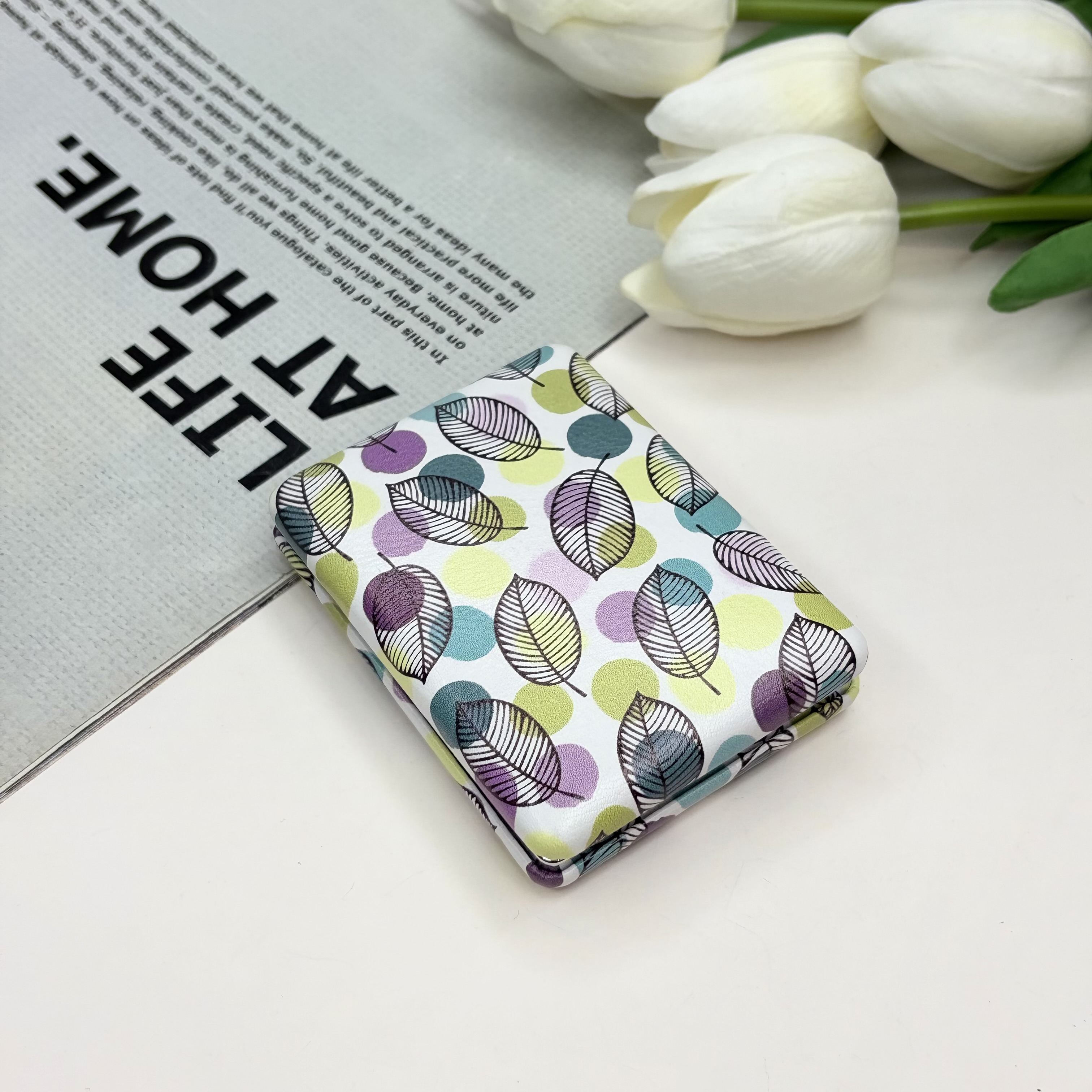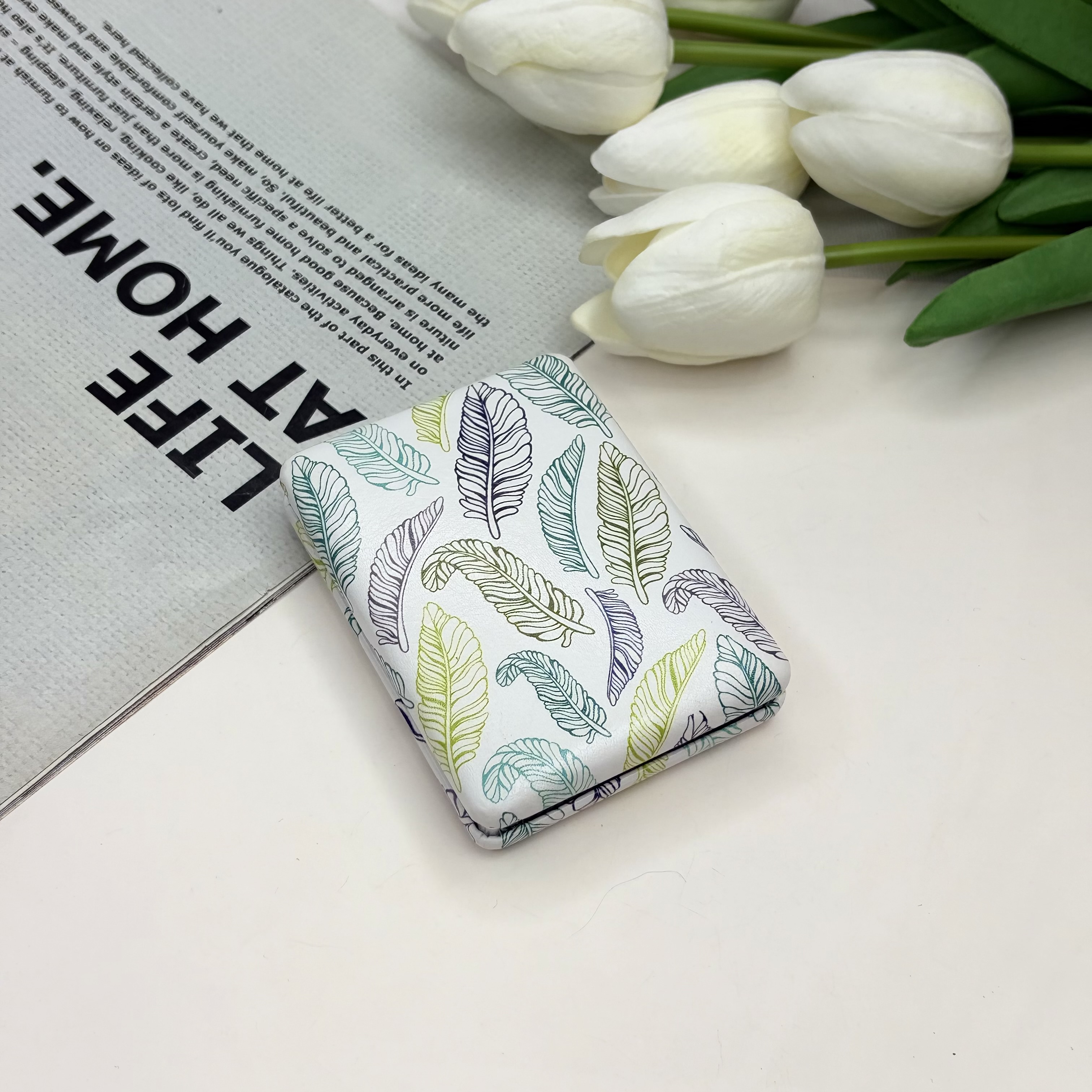 آینه جیبی دوطرفه طرح برگ مستطیلی چرم 8.5cm در 6cm