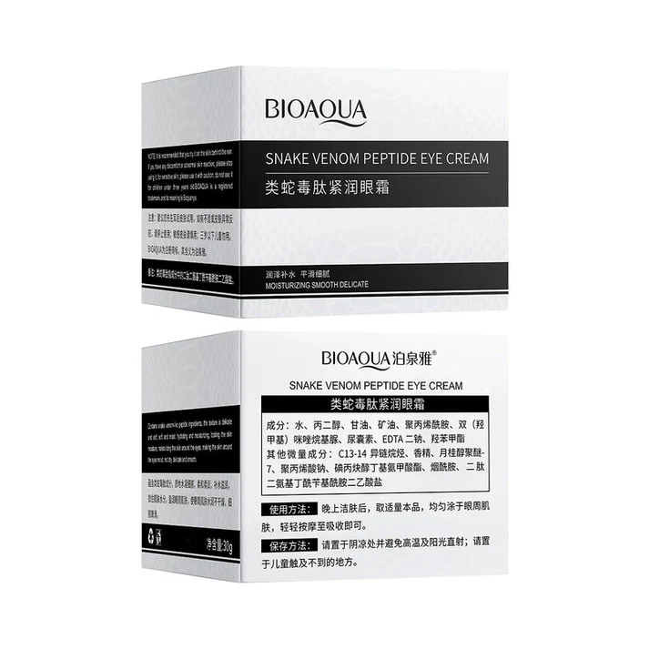 این کرم دور چشم بایوآکوا حاوی روغن مار است که فوایدی فوق العاده برای بدن و پوست دارد. سم مار موجود در ساختار این محصول، ماده اصلی تشکیل دهنده بوتاکس بوده و ویژگی اصلی آن لیفتینگ پوست زیر چشم است. استفاده از این کرم موجب جوانسازی، بازسازی آسیب های پوستی و حذف آثار پیری می شود.