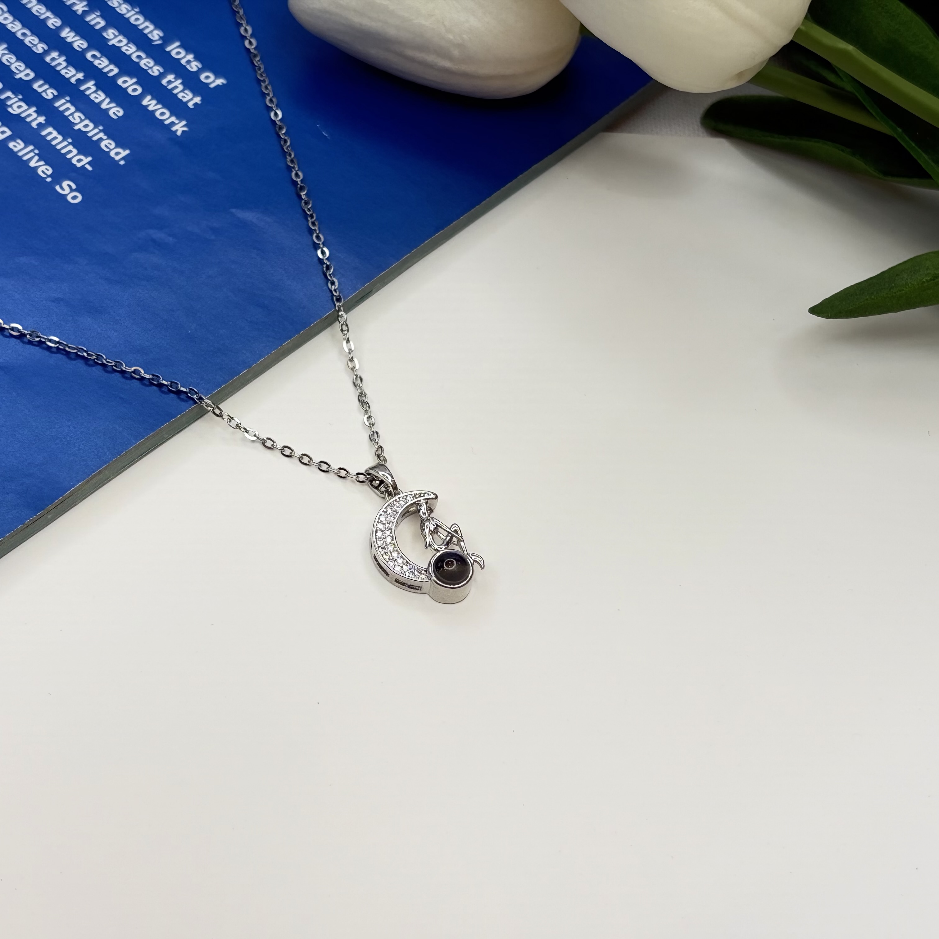 گردنبند دوستت دارم به صد زبان دنیا تلسکوپی رنگ‌نقره ای طرح ماه